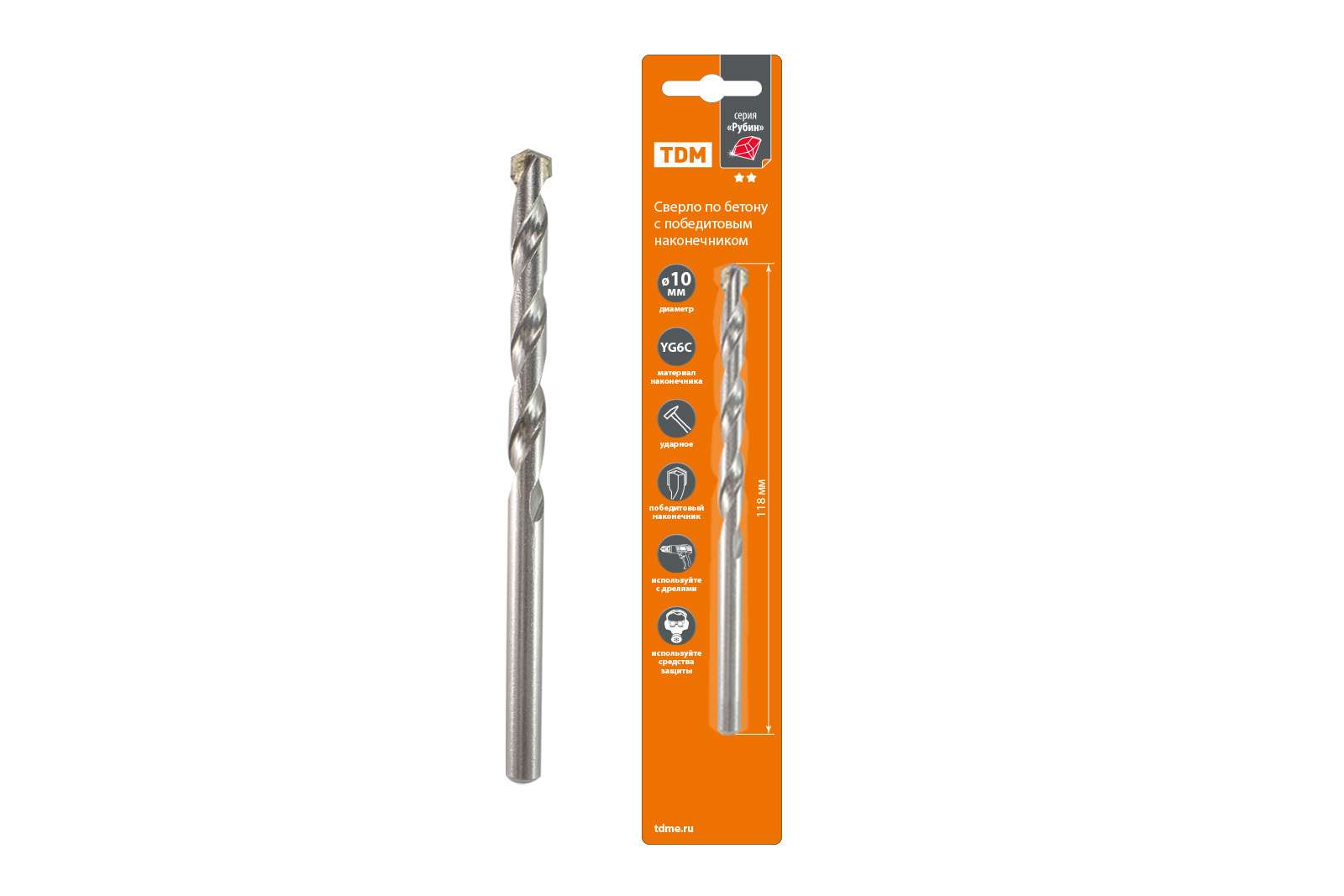 Наименование: Сверло по бетону, ударное, 10?118 мм, победит. након, цилиндр. хвост, блистер 1 шт, "Рубин" TDM