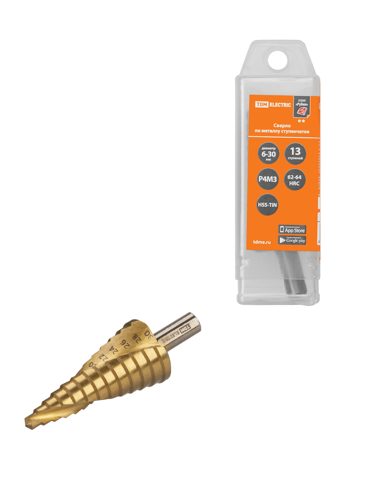Наименование: Сверло по металлу ступенчатое, 6-30 мм, 13 ступеней, нитрид., HSS, цилиндр. хв., "Рубин" TDM