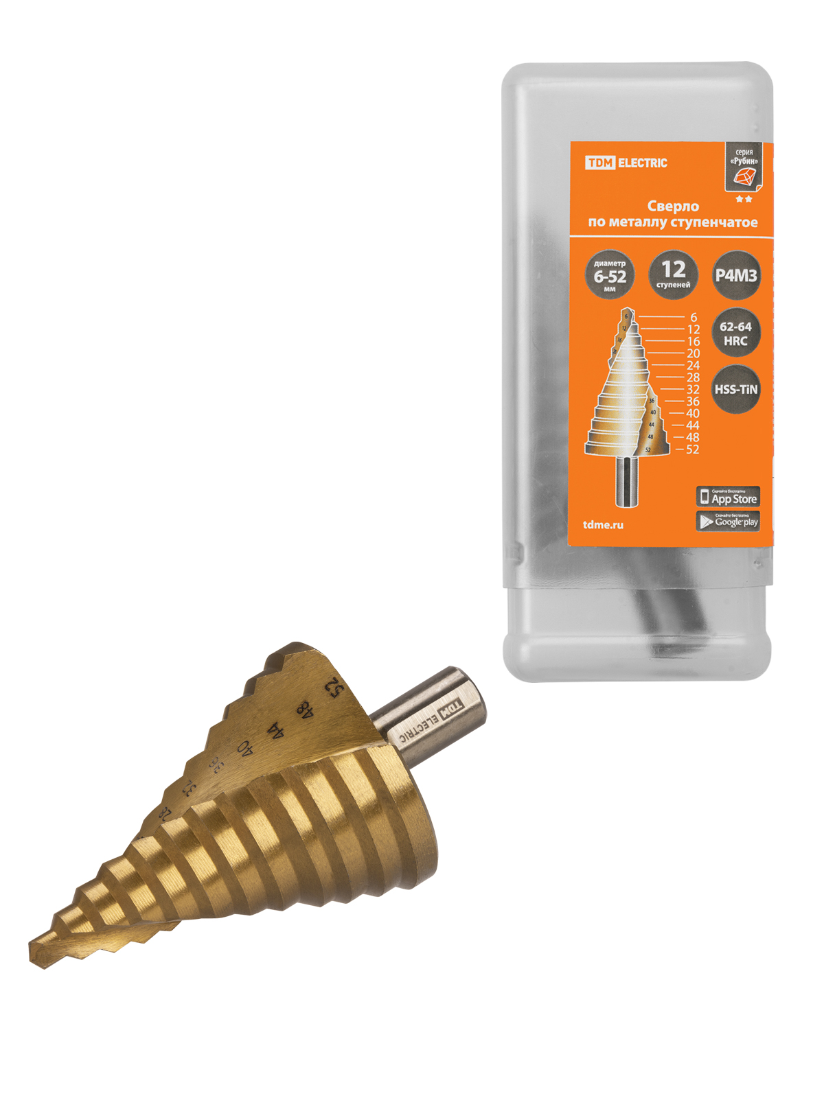 Наименование: Сверло по металлу ступенчатое, 6-52 мм, 12 ступеней, нитрид., HSS, цилиндр. хв., "Рубин" TDM