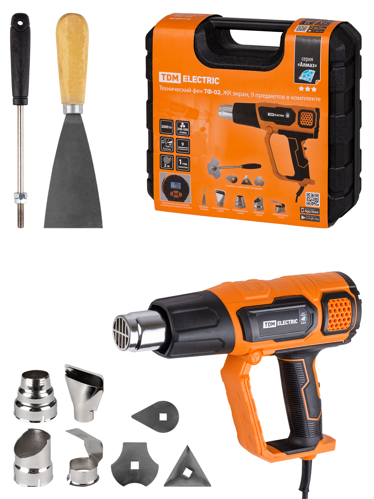Наименование: Технический фен ТФ-02, 2000 Вт, 9 предм., ЖК-экр., 2 реж., плавн. рег., 50-600 C, кейс, "Алмаз" TDM
