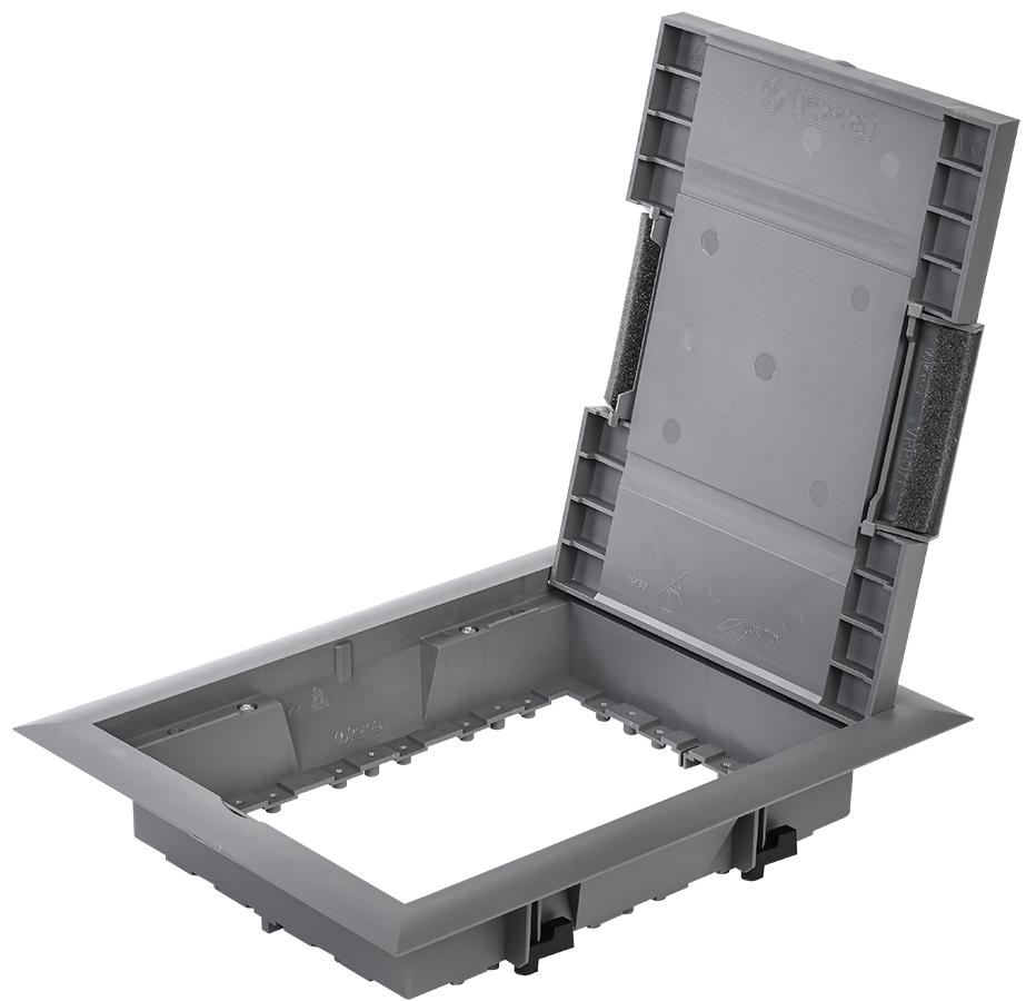 Описание: Лючок напольный ONFLOOR 24. Предназначен для организации рабочих мест в офисных или административных помещениях. В лючок можно установить до 24 модулей (12 постов 45х45 мм / 24 модуля 45х22,5). Возможна установка лючка в фальшпол толщиной от 10 до 40 мм, необходимое монтажное отверстие для установки лючка 218х288 мм, либо в бетонный пол с обязательным использованием коробки напольной: KNU-80-16-PA-9011 (рама лючка крепится на коробке напольной с помощью винтов, которые поставляются в комплекте). Крышка лючка имеет небольшое углубление, усиленное стальным листом, для монтажа напольного покрытия с максимальной толщиной 7 мм (рекомендуемые напольные покрытия - ковер или ламинат). Крышка содержит 2 откидных вывода с мягким материалом, которые позволяют организовать вывод кабелей из лючка. Степень защиты IP30 - коробка не предназначена для влажной уборки. Конструкция лючков рассчитана на максимальную нагрузку 1500Н. Комплект поставки: Лючок напольный ONFLOOR 24 - 1 шт., трафарет для финишного покрытия - 1 шт., комплект крепежа - 1 компл. Рамки для установки ЭУИ и коробки для установки лючка в бетонный пол приобретаются отдельно. Цвет: тeмно-серый RAL 7012. Пример комплектации лючка: 8 модулей: 1 шт. - KNR-80-00-7012, 1 шт. - KNP-80-16-PA-7012, 1 шт. - KNR-80-45-7012; 16 модулей: 2 шт. - KNP-80-16-PA-7012, 2 шт. - KNR-80-45-7012; 24 модуля: 2 шт. - PM-LN10D-RP-12-K03.