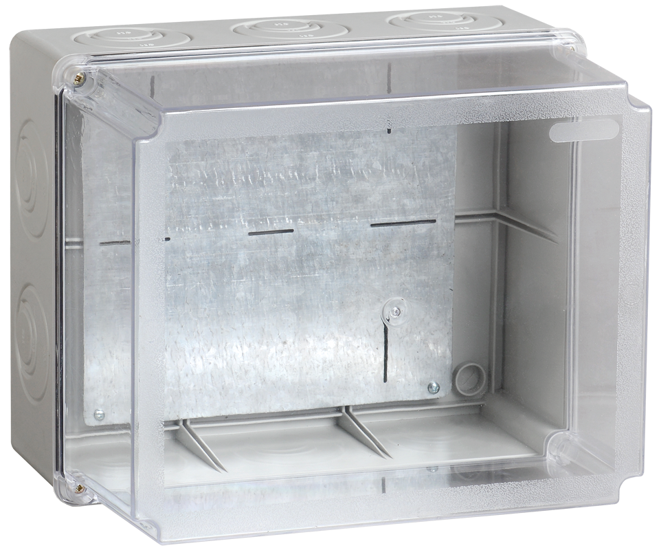Наименование: Коробка распаячная КМ41348 для открытой проводки 240х195х165мм с монтажной платой с прозрачной крышкой IP55 5 вводов серая IEK