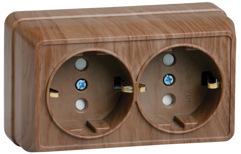 Наименование: OKTAVA Розетка 2-местная с заземлением с защитными шторками для открытой установки 16А РСш22-3-ОД дуб IEK