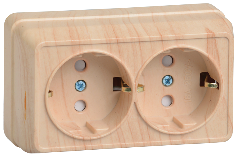 Наименование: OKTAVA Розетка 2-местная с заземлением с защитными шторками для открытой установки 16А РСш22-3-ОС сосна IEK
