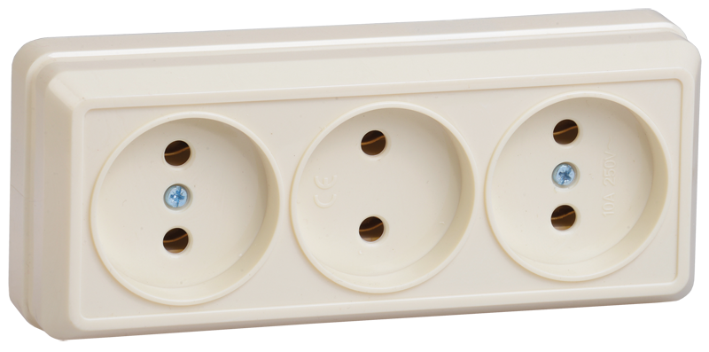 Наименование: OKTAVA Розетка 3-местная без заземления для открытой установки 10А РС23-2-ОК кремовый IEK