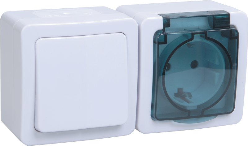 Наименование: Блок горизонтальный для открытой установки БГб-22-31-ГПБд (Выключатель 1-клавишный + розетка 1-местная с заземляющим контактом) IP54 ГЕРМЕС PLUS (белый/дымчатый) IEK