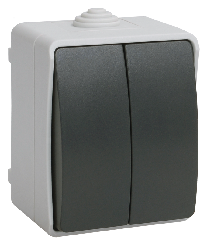 Наименование: ФОРС Выключатель 2-клавишный для открытой установки 10А IP54 ВС20-2-0-ФСр серый IEK
