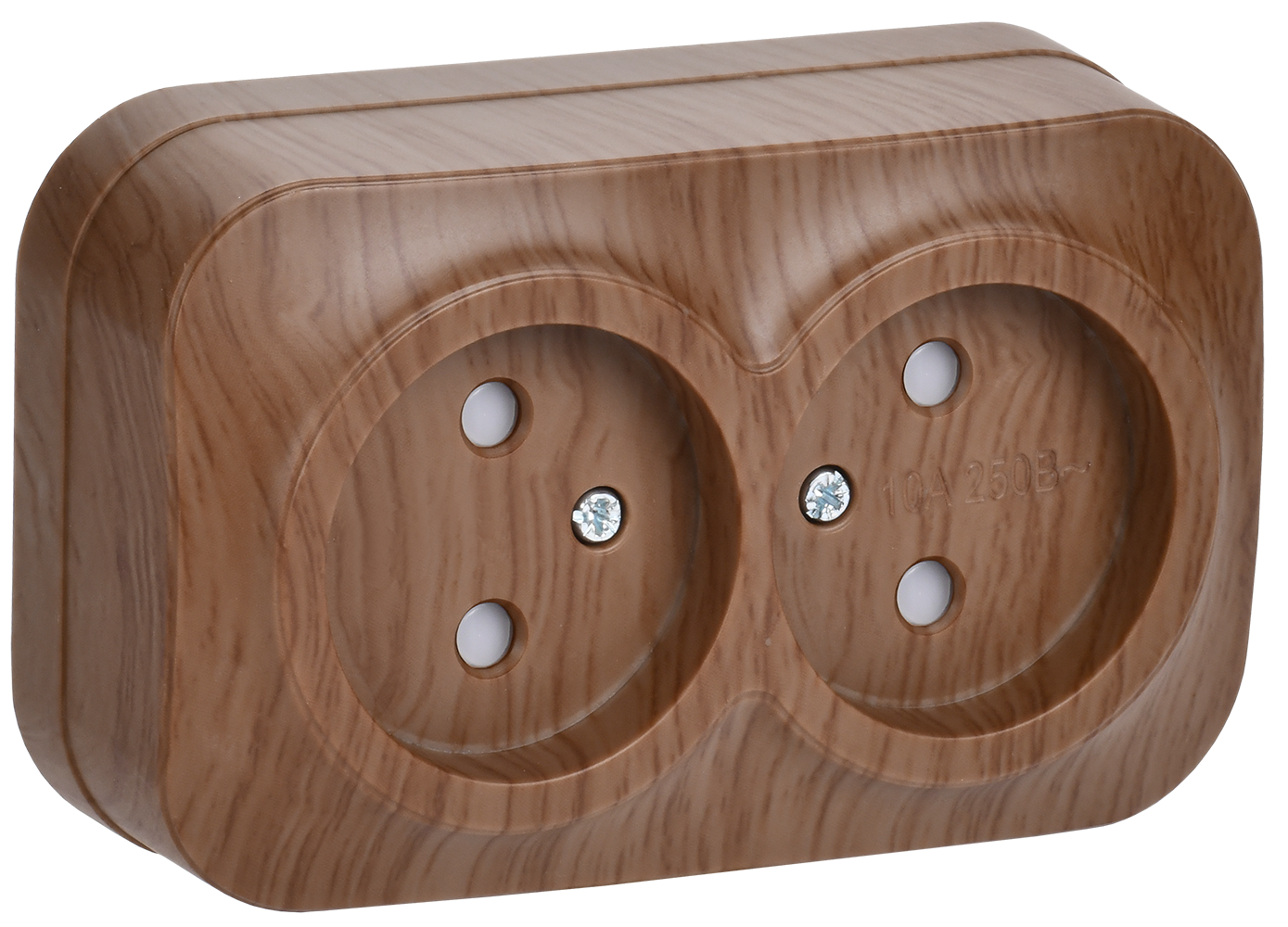 Наименование: Розетка двухместная для открытой установки РСш22-2-ХД без заземления с защитной шторкой 10А GLORY дуб IEK