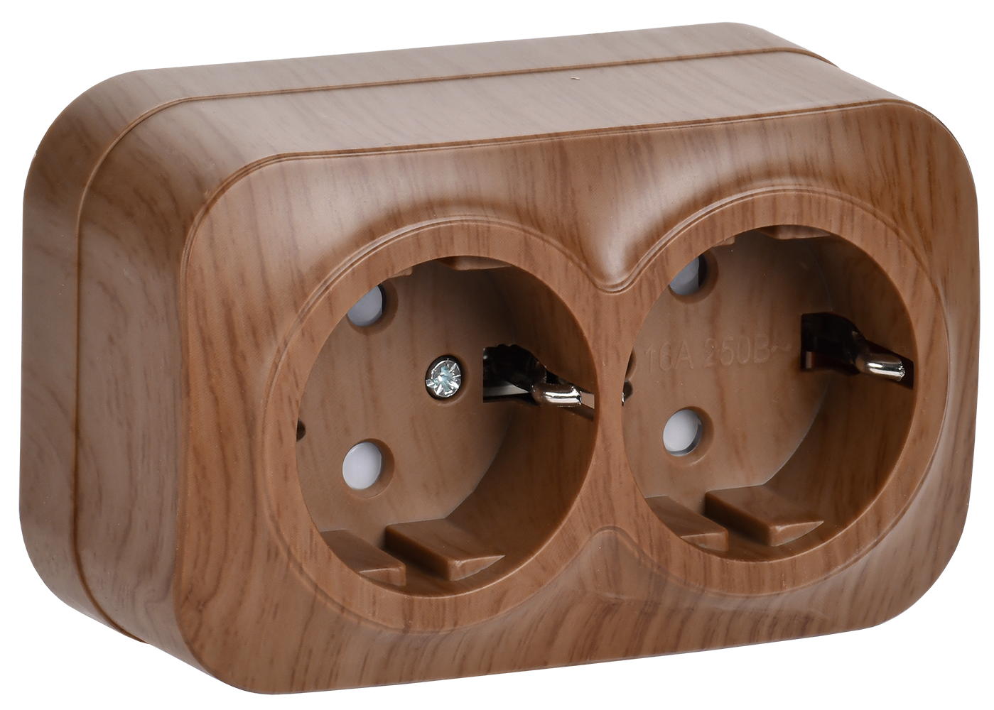 Наименование: Розетка двухместная для открытой установки РСш22-3-ХД с заземлением и защитной шторкой 16А GLORY дуб IEK