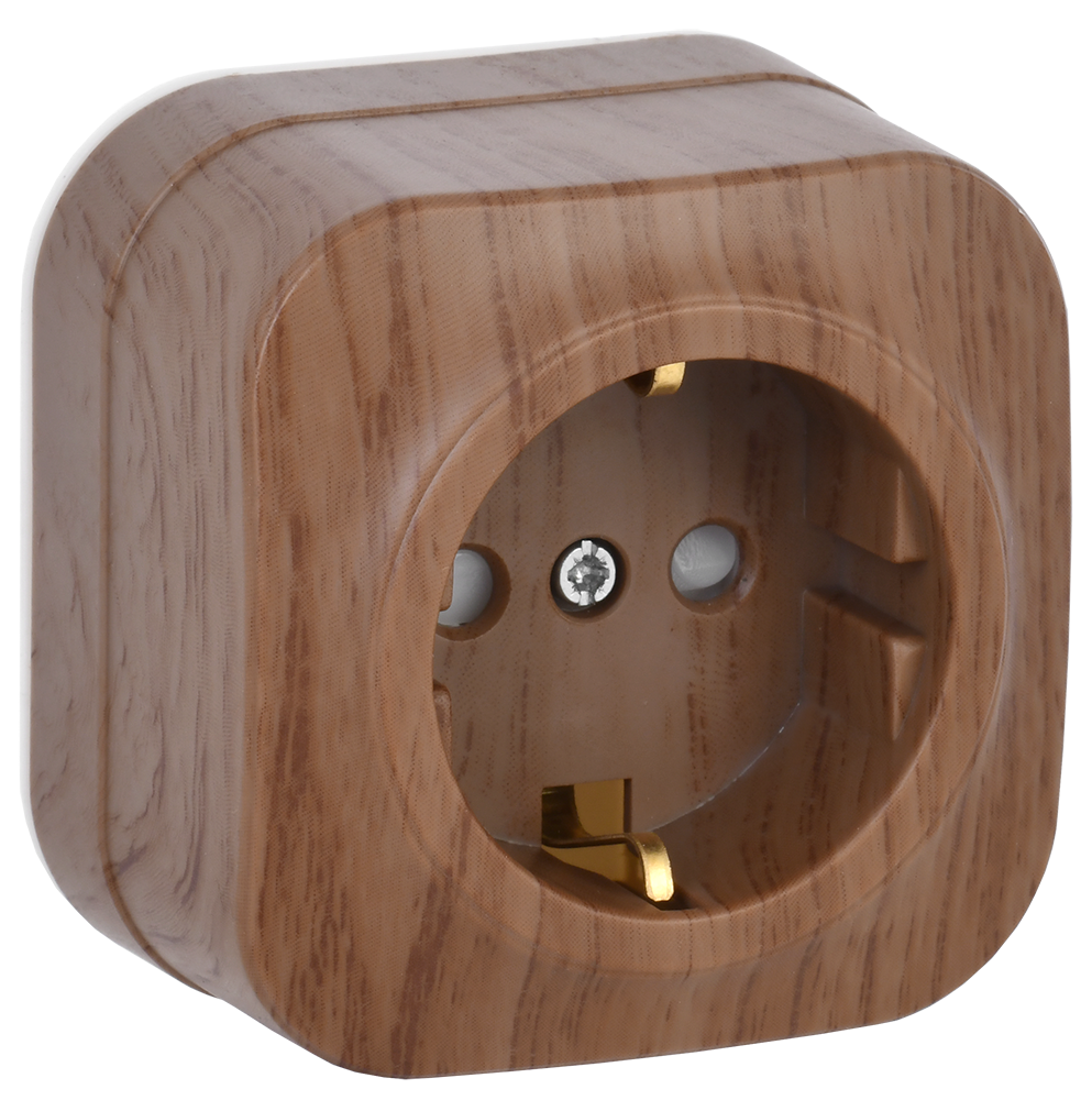 Наименование: Розетка одноместная для открытой установки РСш20-3-ХД с заземлением и защитной шторкой 16А GLORY дуб IEK