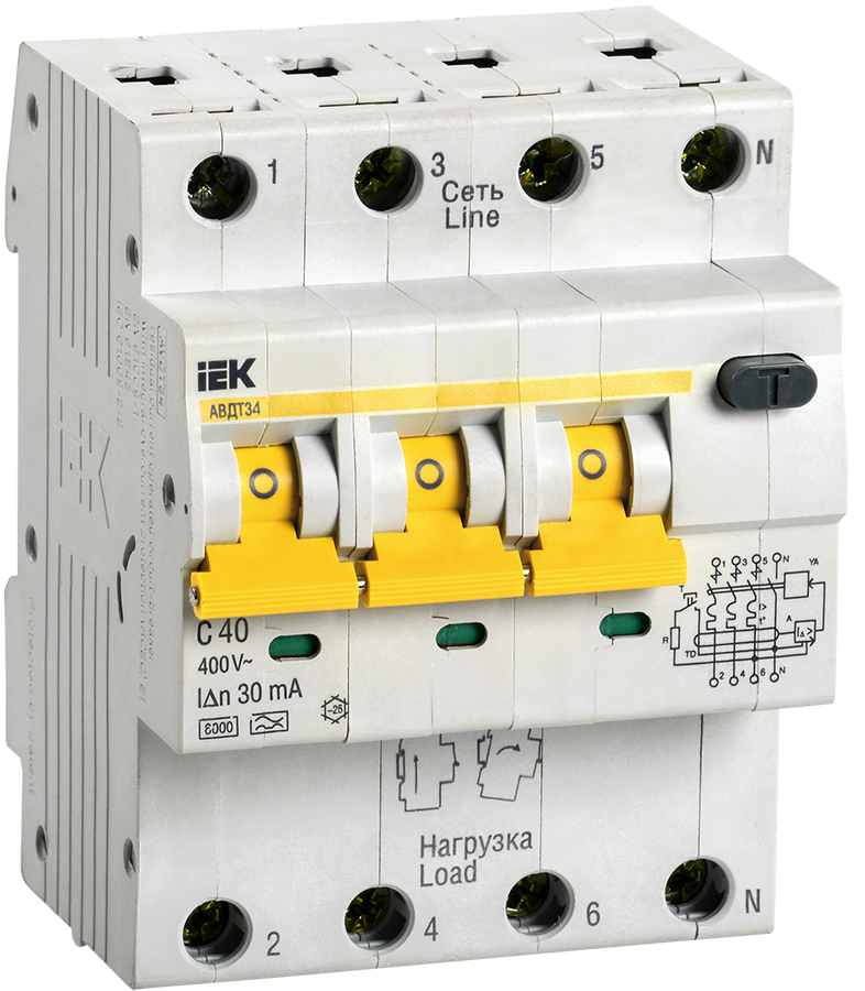 Преимущества: Компактная конструкция автоматического выключателя, управляемого дифференциальным током со встроенной защитой от сверхтоков. Номинальный условный ток короткого замыкания 6000А позволяет устанавливать автоматические выключатели дифференциального тока АВДТ34 в качестве вводных автоматов защиты. Рабочая характеристика при наличии дифференциального тока - тип А, обеспечивает универсальную защиту от поражения током при случайном непреднамеренном прикосновении к проводнику, и защиту от токов утечек. Высокая электрическая износостойкость - не менее 6000 включений. Серебросодержащие напайки на контактах. Широкий ассортимент номинальных токов (6, 10, 16, 20, 25, 32, 40, 50, 63 А) и номинальных отключающих дифференциальных токов (10, 30, 100, 300 мА) Индикатор положения контактов. Расширенный диапазон рабочих температур от –25°С до +40°С. Насечки на контактных зажимах снижают тепловые потери и увеличивают механическую прочность соединения. Эргономичная кнопка ТЕСТ для проверки работоспособности устройства и правильности подключения. Главные контакты 4-х полюсного автоматического выключателя дифференциального тока АВДТ34 сконструированы так, что нейтральный контакт замыкается раньше и отключается позже, что позволяет избежать перекоса фаз напряжения нагрузки, аналогично "обрыву нуля" в сети.