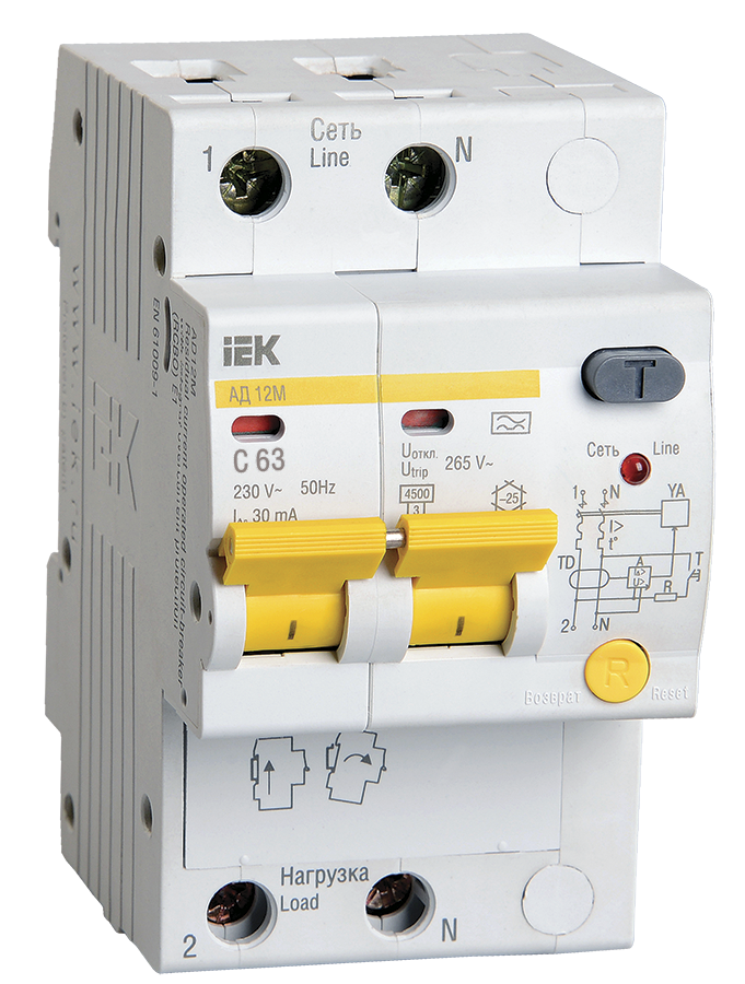 Наименование: Дифференциальный автоматический выключатель АД12М 2Р С63 30мА IEK