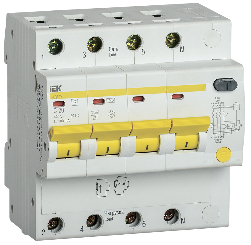 Наименование: Дифференциальный автоматический выключатель АД14S 4Р 20А 100мА IEK
