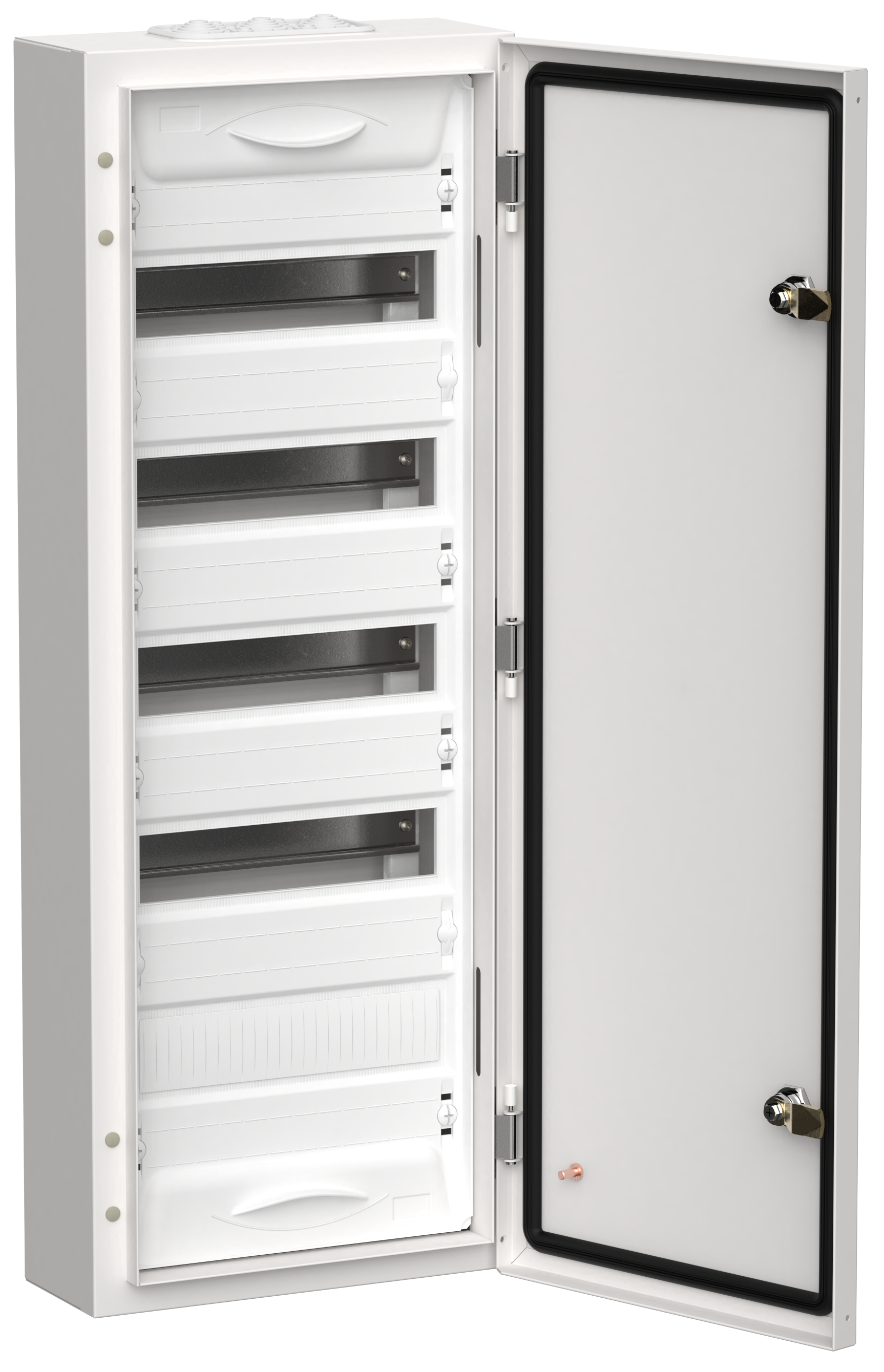 Преимущества: Широкий размерный ряд. Модульная ёмкость от 12 до 216 модулей. Высокая степень защиты – IP54. Удобный монтаж: отсутствие перегородки между секциями корпуса; съемная монтажная рама. Увеличенное пространство за DIN-рейками для прокладки кабеля. Возможность пломбировки фальш-панели. Перенавешиваемая дверь. Многофункциональный кабельный ввод. Возможность установки шин сверху и снизу. Полная комплектация. Стильный дизайн.