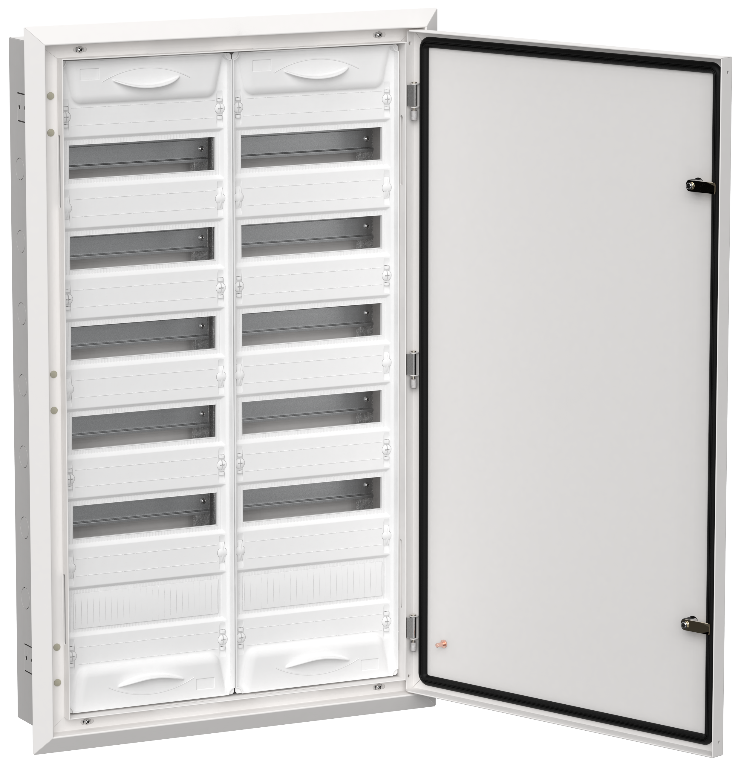 Преимущества: Широкий размерный ряд. Модульная ёмкость от 12 до 252 модулей. Удобный монтаж: отсутствие перегородки между секциями корпуса; съемная монтажная рама. Увеличенное пространство за DIN-рейками для прокладки кабеля. Возможность пломбировки фальш-панели. Перенавешиваемая дверь. Возможность установки шин сверху и снизу. Полная комплектация. Стильный дизайн.