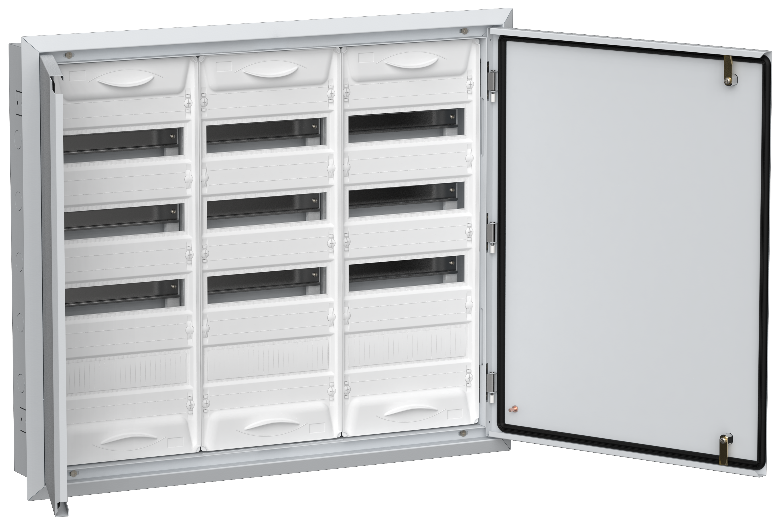 Преимущества: Широкий размерный ряд. Модульная ёмкость от 12 до 252 модулей. Удобный монтаж: отсутствие перегородки между секциями корпуса; съемная монтажная рама. Увеличенное пространство за DIN-рейками для прокладки кабеля. Возможность пломбировки фальш-панели. Перенавешиваемая дверь. Возможность установки шин сверху и снизу. Полная комплектация. Стильный дизайн.