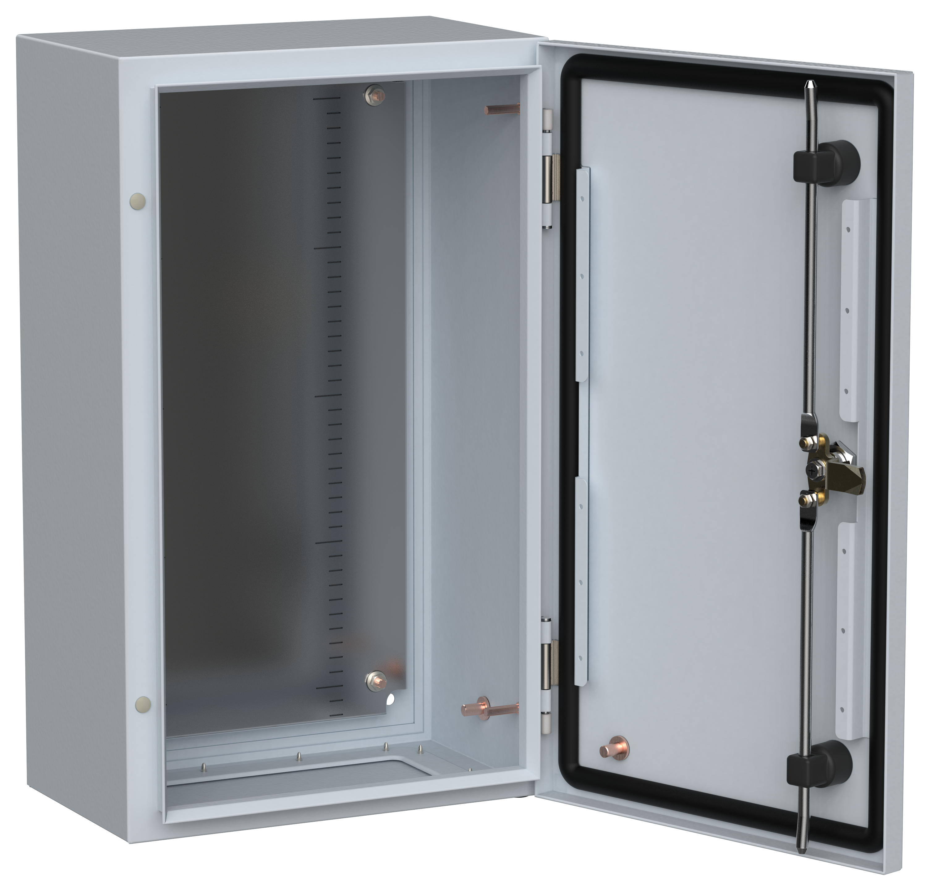 Преимущества: Высокая степень защиты IP66, УХЛ1 - возможность уличного использования корпусов под открытым небом. Грунтование перед окрашиванием – максимальная защита от коррозии. Трехточечное запирание двери одним поворотом ключа (для корпусов высотой от 500 мм). Двойная заковка кромок по периметру двери и оболочки обеспечивает дополнительную жесткость корпуса. Комплект для навески и провод заземления входят в базовую комплектацию корпуса.