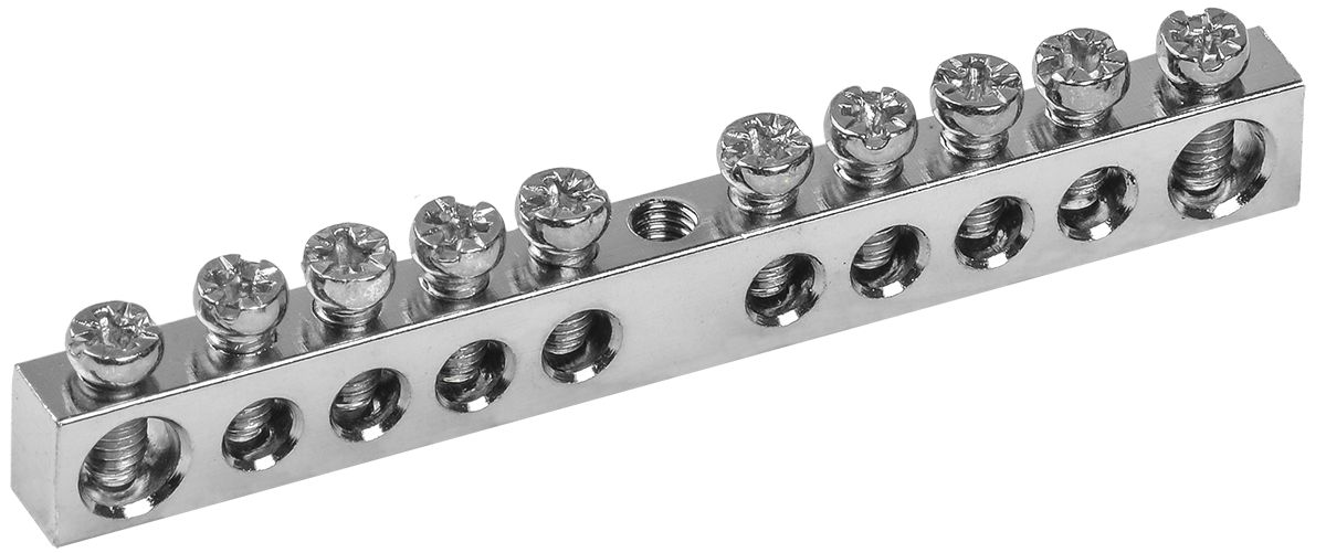 Наименование: Шина PEN "земля-ноль" 6х9мм 10/1 с никелевым покрытием (10групп/крепеж по центру) IEK