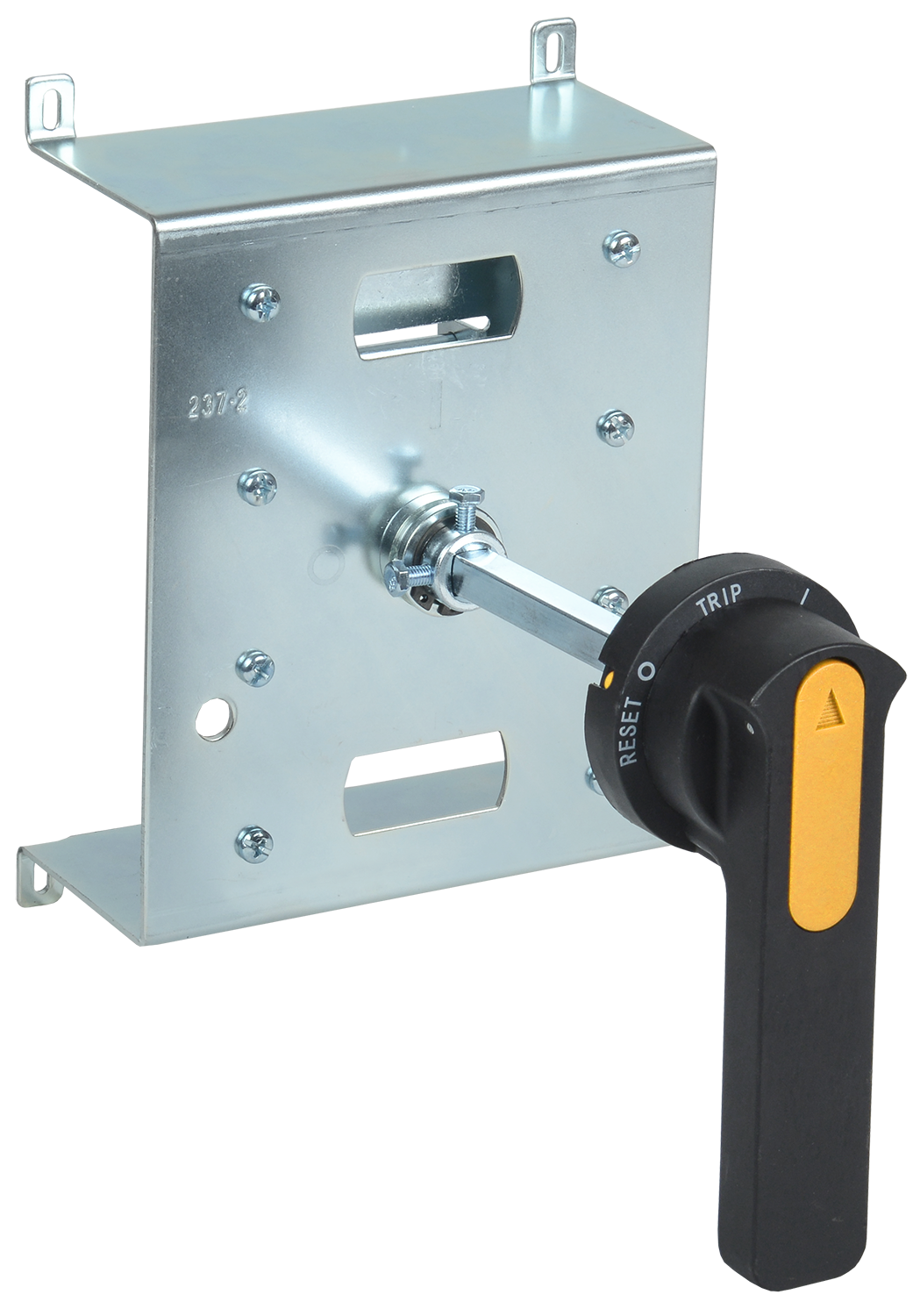 Описание: Ручной поворотный привод ПРПм предназначен для преобразования вращательного движения в поступательное для управления автоматическим выключателем ВА88 MASTER. Привод закрепляется на двери распределительного устройства для оперирования выключателем через дверь или непосредственно на выключателе.