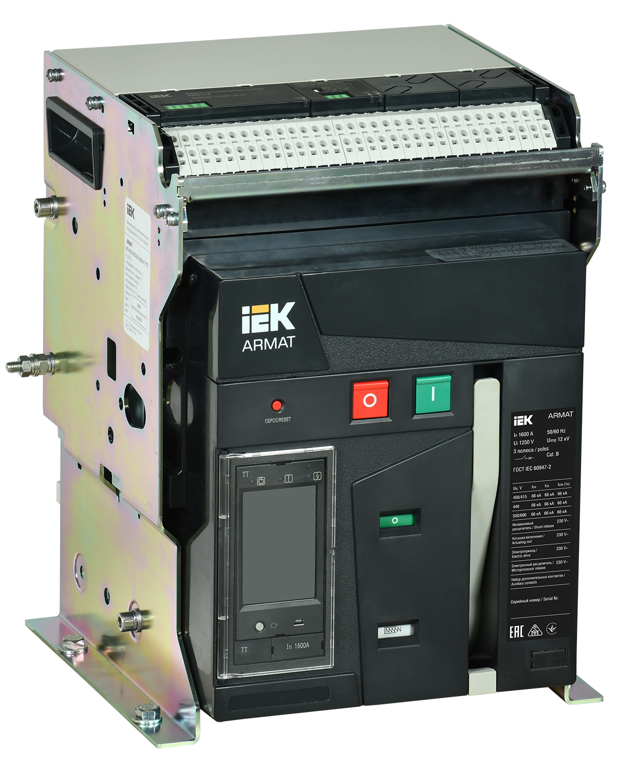 Наименование: ARMAT Воздушный автоматический выключатель стационарного исполнения 3P типоразмер A 66кА 1600А расцепитель TT с комплектом аксессуаров 220В: мотор привод катушка включения катушка отключения IEK