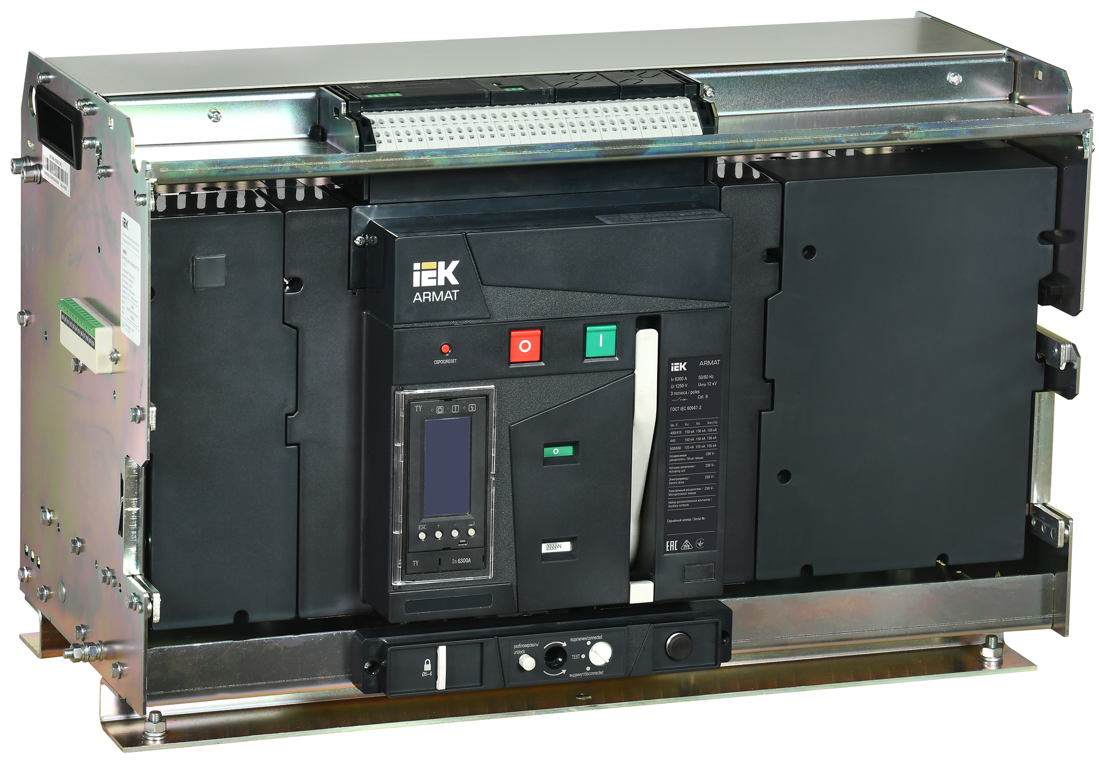 Наименование: ARMAT Воздушный автоматический выключатель выдвижного исполнения 3P типоразмер H 150кА 6300А расцепитель TY с комплектом аксессуаров 220В: мотор привод катушка включения катушка отключения IEK