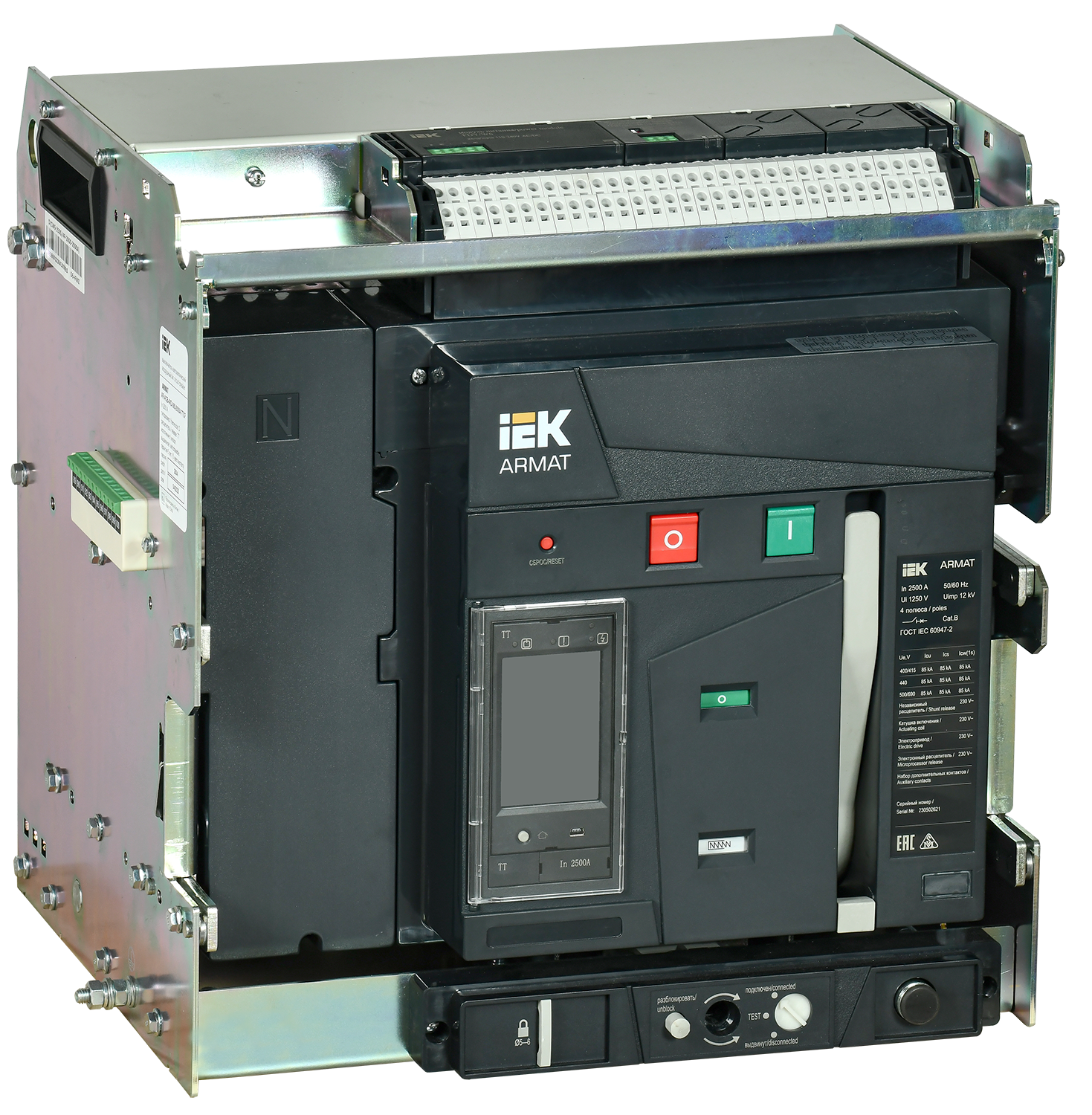 Наименование: ARMAT Воздушный автоматический выключатель выдвижного исполнения 4P типоразмер D 85кА 2500А расцепитель TT с комплектом аксессуаров 220В: мотор привод катушка включения катушка отключения IEK