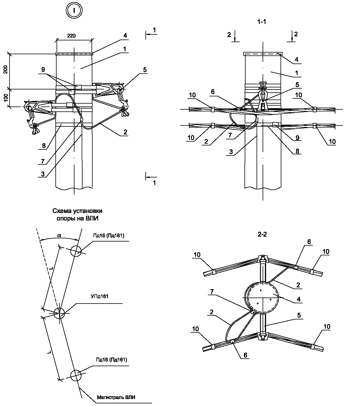 Описание: В составе проекта разработаны деревянные опоры ВЛИ 0,4кВ в соответствии с требованиями ПУЭ 7 издания. Опоры ВЛИ 0,4кВ разработаны на базе деревянных стоек длиной 9,5м, 11м, 12м. Одно и двухцепные опоры могут применяться в I-IV районах по ветру и гололёду. На всех типах опор предусмотрена возможность ответвления к вводам в здания в одну и в две стороны от ВЛ двух, четырех и 2х2 жил СИП. Опора УПд161 устанавливается в случаях, когда требуется выполнять повторные заземления и заземления для защиты от атмосферных перенапряжений. Максимально допустимый угол поворота ВЛИ 8 градусов.
