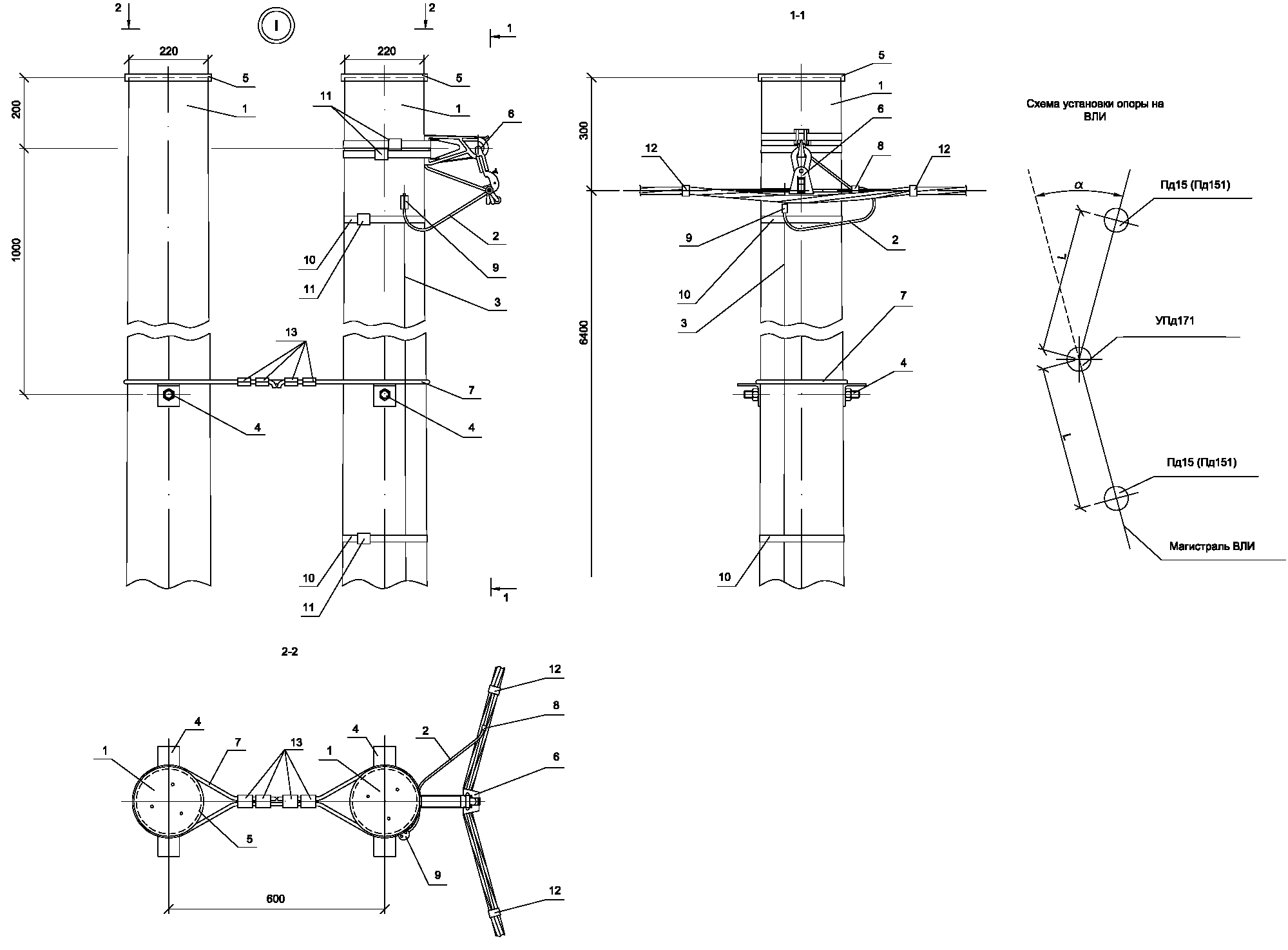 Описание: В составе проекта разработаны деревянные опоры ВЛИ 0,4кВ в соответствии с требованиями ПУЭ 7 издания. Опоры ВЛИ 0,4кВ разработаны на базе деревянных стоек длиной 9,5м, 11м, 12м. Одно и двухцепные опоры могут применяться в I-IV районах по ветру и гололёду. На всех типах опор предусмотрена возможность ответвления к вводам в здания в одну и в две стороны от ВЛ двух, четырех и 2х2 жил СИП. Опора УПд171 устанавливается в случаях, когда требуется выполнять повторные заземления и заземления для защиты от атмосферных перенапряжений. Максимально допустимый угол поворота ВЛИ 45 градусов.