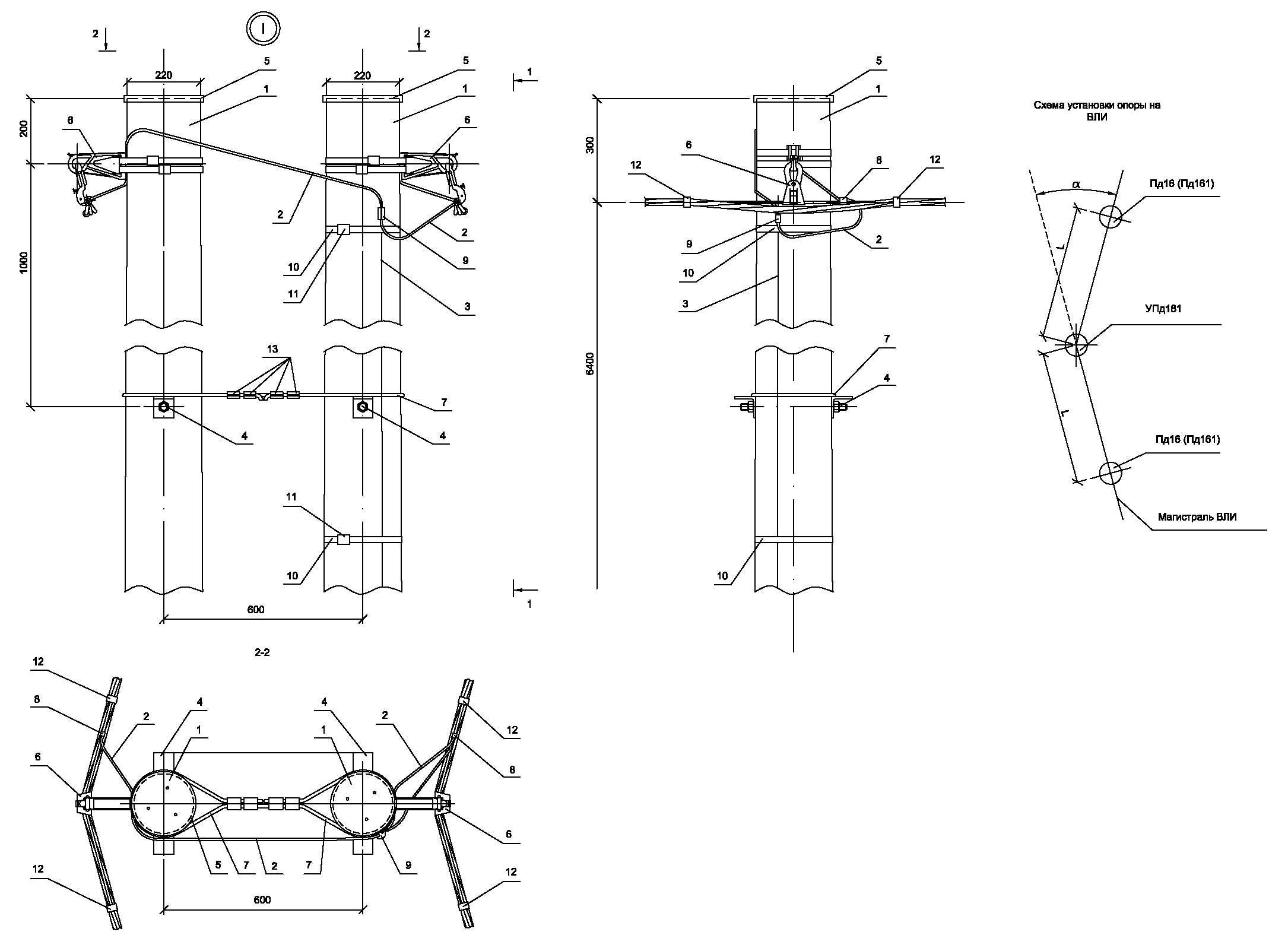 Описание: В составе проекта разработаны деревянные опоры ВЛИ 0,4кВ в соответствии с требованиями ПУЭ 7 издания. Опоры ВЛИ 0,4кВ разработаны на базе деревянных стоек длиной 9,5м, 11м, 12м. Одно и двухцепные опоры могут применяться в I-IV районах по ветру и гололёду. На всех типах опор предусмотрена возможность ответвления к вводам в здания в одну и в две стороны от ВЛ двух, четырех и 2х2 жил СИП. Опора УПд181 устанавливается в случаях, когда требуется выполнять повторные заземления и заземления для защиты от атмосферных перенапряжений. Максимально допустимый угол поворота ВЛИ 25 градусов.