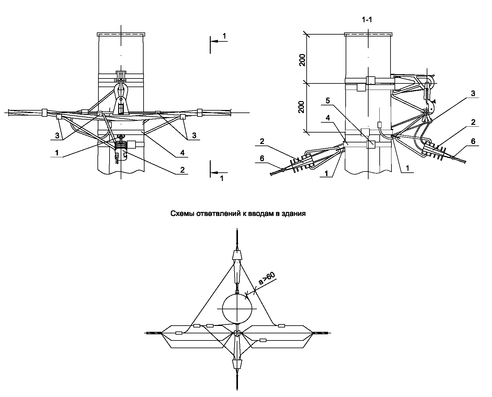 Описание: Ответвления к вводам в здания от одноцепной промежуточной опоры.