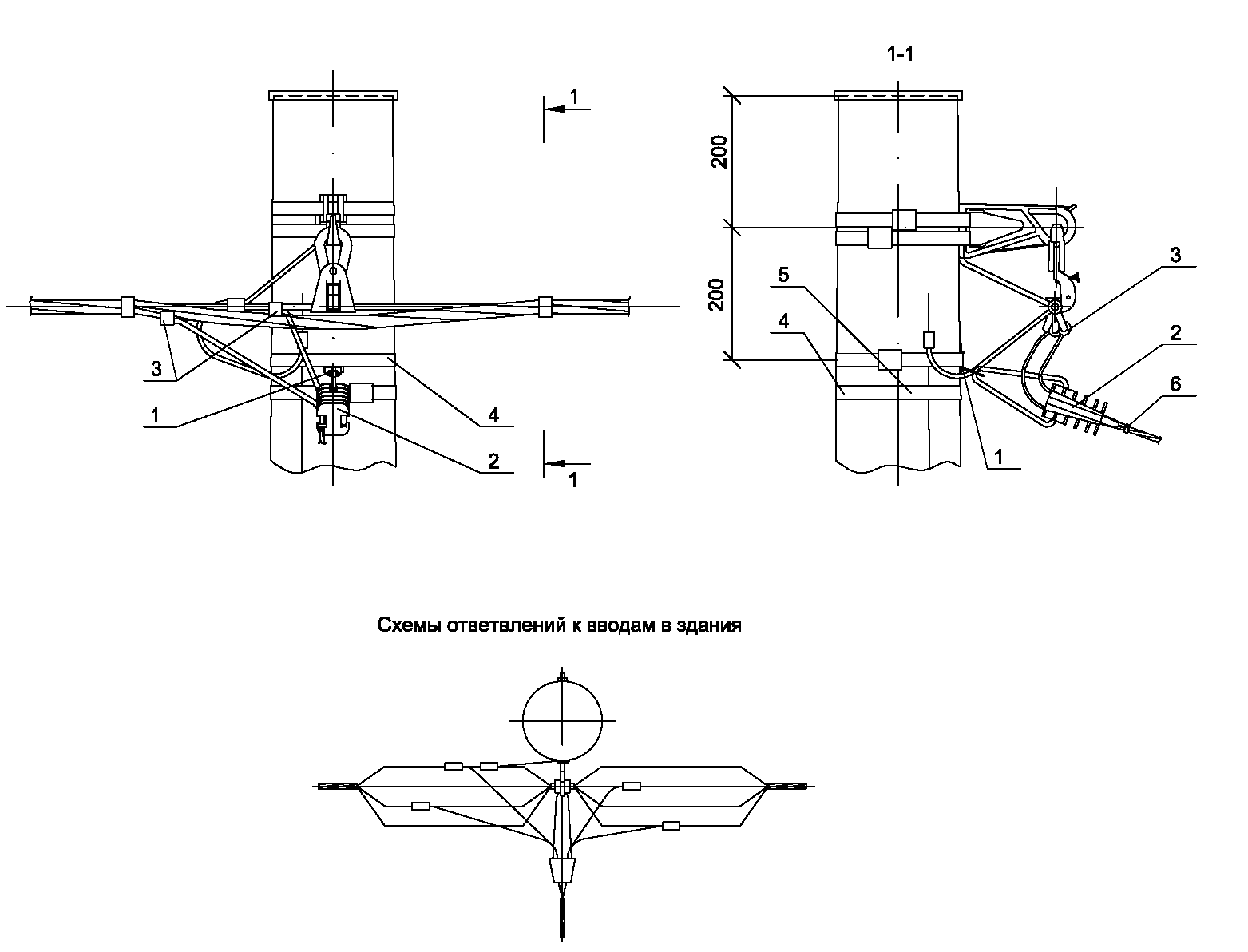 Описание: Ответвления к вводам в здания от одноцепной промежуточной опоры.