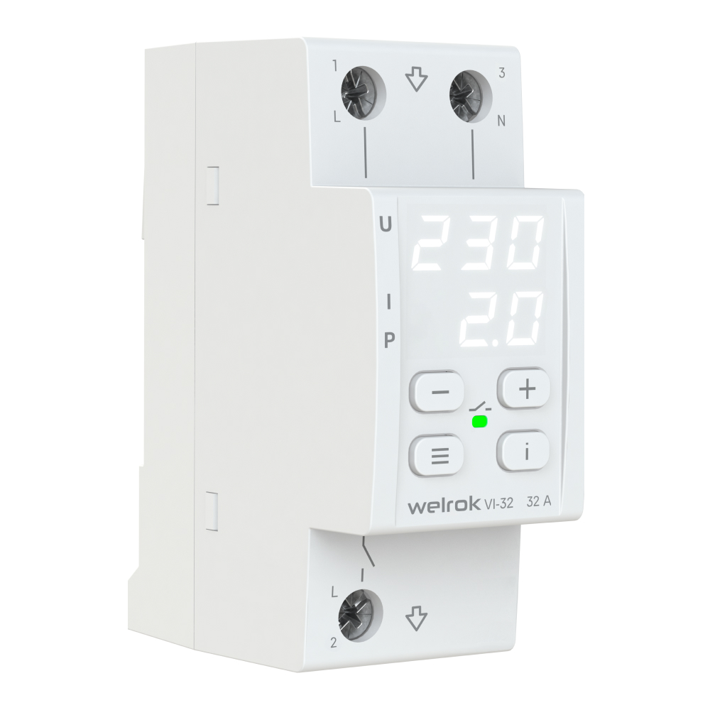 Описание: Реле напряжения с контролем тока Welrok VI защищает оборудование от скачков и провалов напряжения, последствий обрыва нулевого провода и превышения тока или мощности. Реле отключает нагрузку, если напряжение, ток или мощность выходит за установленные пределы и автоматически включает нагрузку, когда значение параметра вернется в норму. Гарантия 10 лет На все реле Welrok действует 10-летняя гарантия от производителя. 3 дополнительных преимущества, которые дает контроль по току в реле: 1. Возможность точного ограничения мощности нагрузки; 2. Возможность равномерно распределить нагрузку по фазам; 3. Визуальный контроль за текущим состоянием нагрузки. Максимальная функциональность Welrok VI — компактное реле на 2 модуля с мощным функционалом: - Позволяет выбрать, по какому из параметров — ток или мощность — будет срабатывать защита вместе с защитой по напряжению. Скорость срабатывания реле < 0,03 сек. TrueRMS для точного измерения напряжения Для уменьшения количества срабатываний: - Защита от частых срабатываний - Регулируемый гистерезис - Регулируемая задержка включения нагрузки - Профессиональная модель отключения при выходе напряжения за пределы Для анализа питающей сети по характеру аварийных срабатываний: - Журнал срабатываний на 100 значений Для комфортной и безопасной эксплуатации: - Поправка напряжения и тока на экране - Регулировка яркости экрана - Защита от перегрева - Корпус реле напряжения изготовлен из пластика, не поддерживающего горение. Простая установка и удобное управление Реле подключается без транзита нуля. Настройка реле осуществляется с помощью трех кнопок: « ? » (меню) и « ? », « ? ». Чтобы увидеть расшифровки аббревиатур, достаточно нажать кнопку « ?? ».