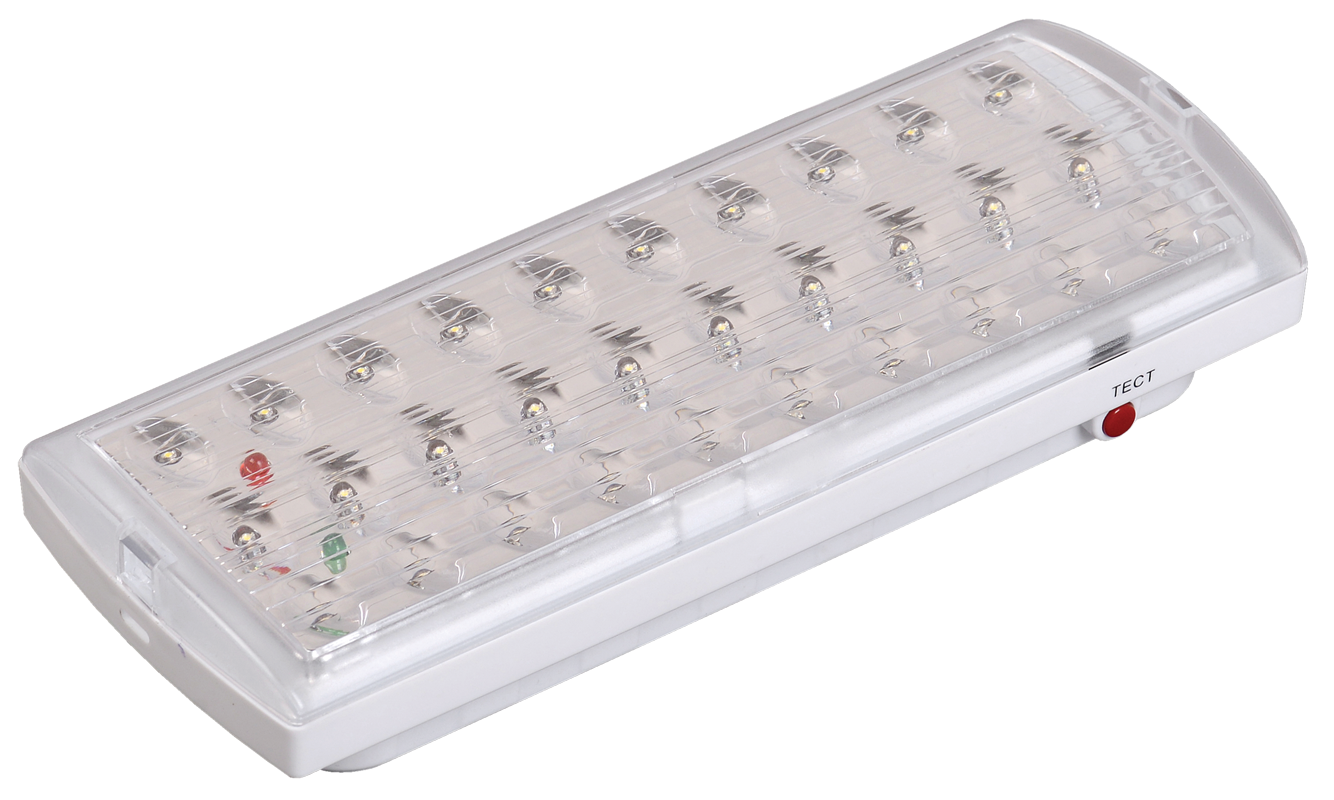 Преимущества: Встроенный никель-кадмиевый аккумулятор. Встроенная защита от глубокого разряда и перезаряда аккумулятора. Встроенная кнопка "Тест", предназначена для проверки работоспособности светильника, имитирующее падение напряжения сети рабочего освещения. Визуальный контроль состояния светильника и батареи. На переднюю панель корпуса выведены два светодиода (индикатора). Зеленый – процесс зарядки аккумулятора. Красный – светильник подключен к сети, аккумулятор заряжен полностью. Работа от аккумулятора – 4ч. Светильники загораются в течение 5 секунд, после падения напряжения рабочего питания.