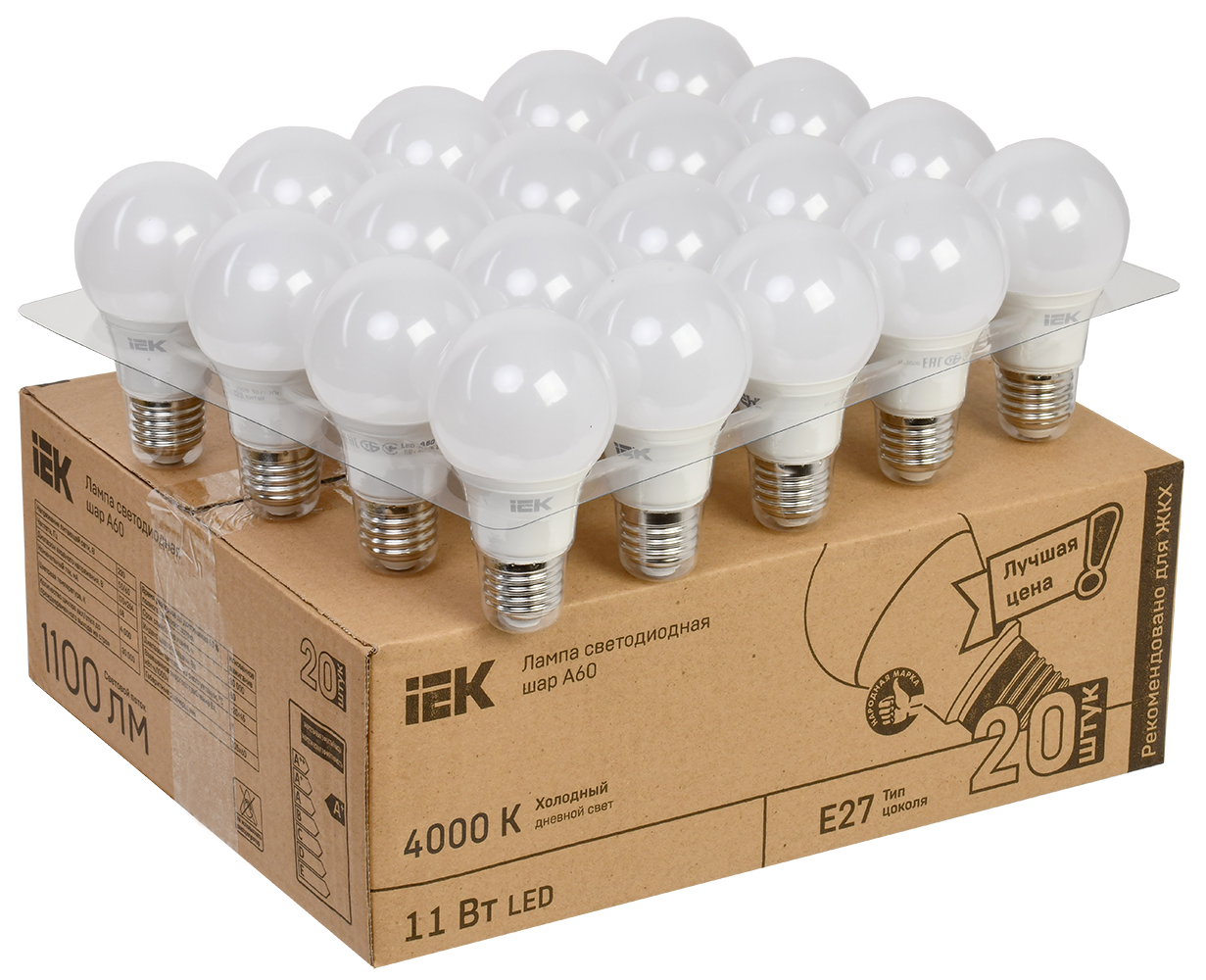 Наименование: Лампа светодиодная A60 груша 11Вт 230В 4000К E27 (20шт/жкхпак) IEK