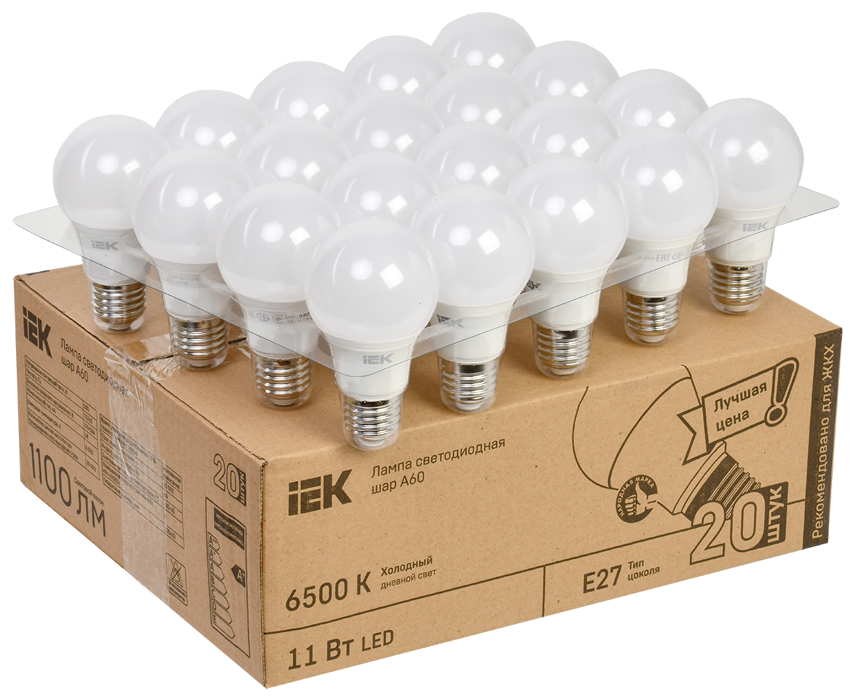 Наименование: Лампа светодиодная A60 груша 11Вт 230В 6500К E27 (20шт/жкхпак) IEK