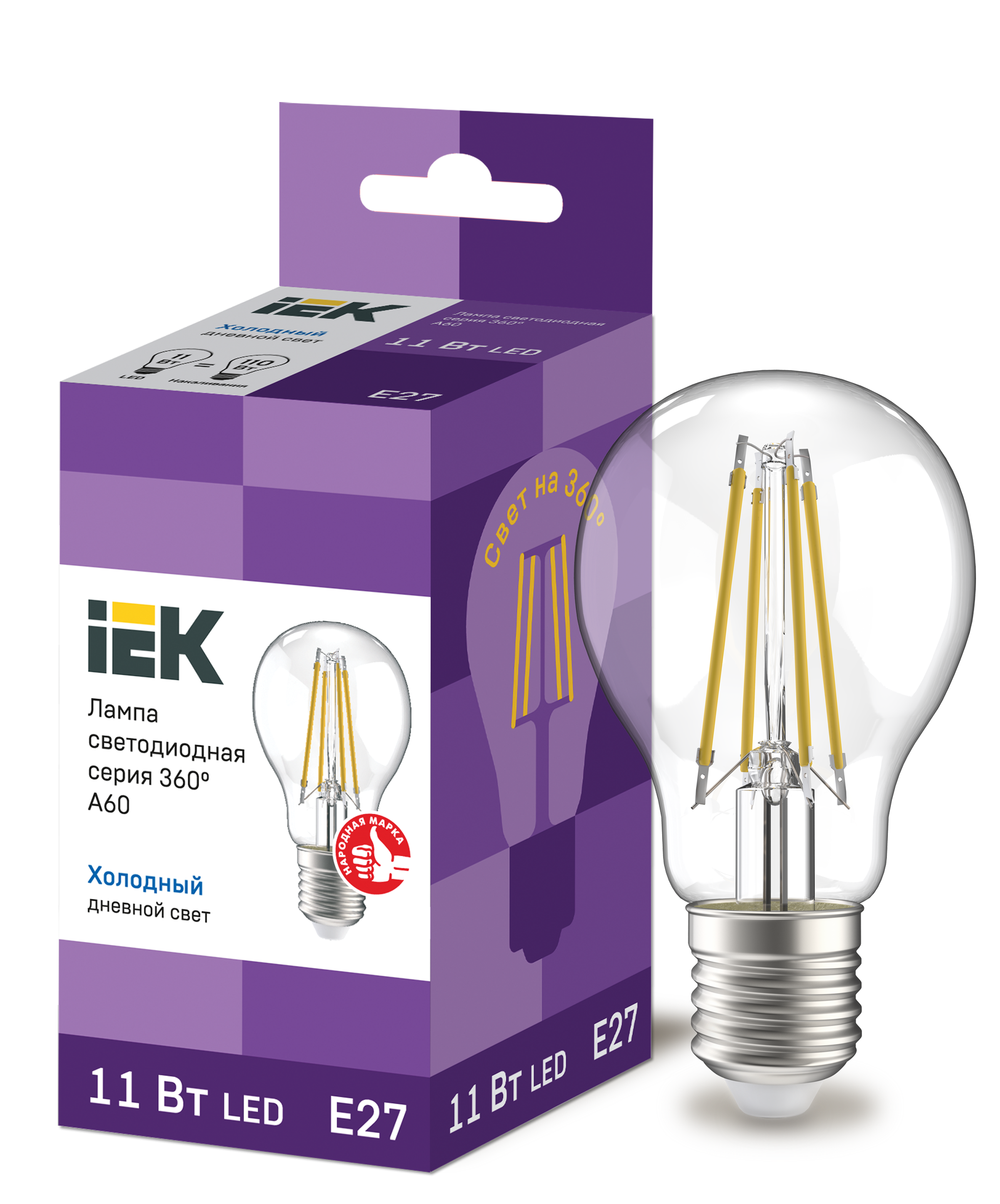 Наименование: Лампа светодиодная A60 груша прозрачная 11Вт 230В 6500К E27 серия 360° IEK