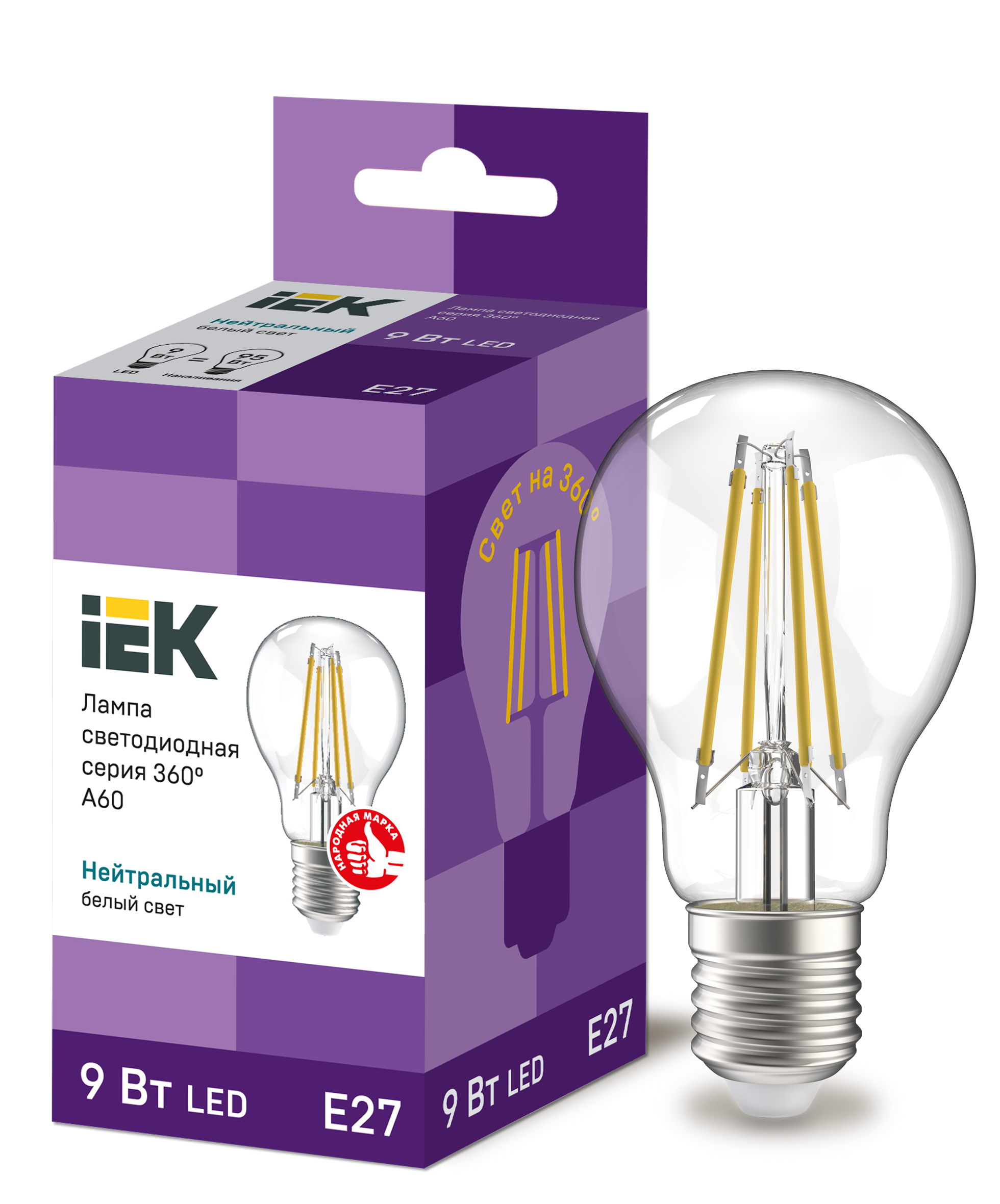 Наименование: Лампа светодиодная A60 груша прозрачная 9Вт 230В 4000К E27 серия 360° IEK