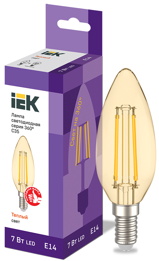Наименование: Лампа светодиодная C35 свеча золото 7Вт 230В 2700К E14 серия 360° IEK