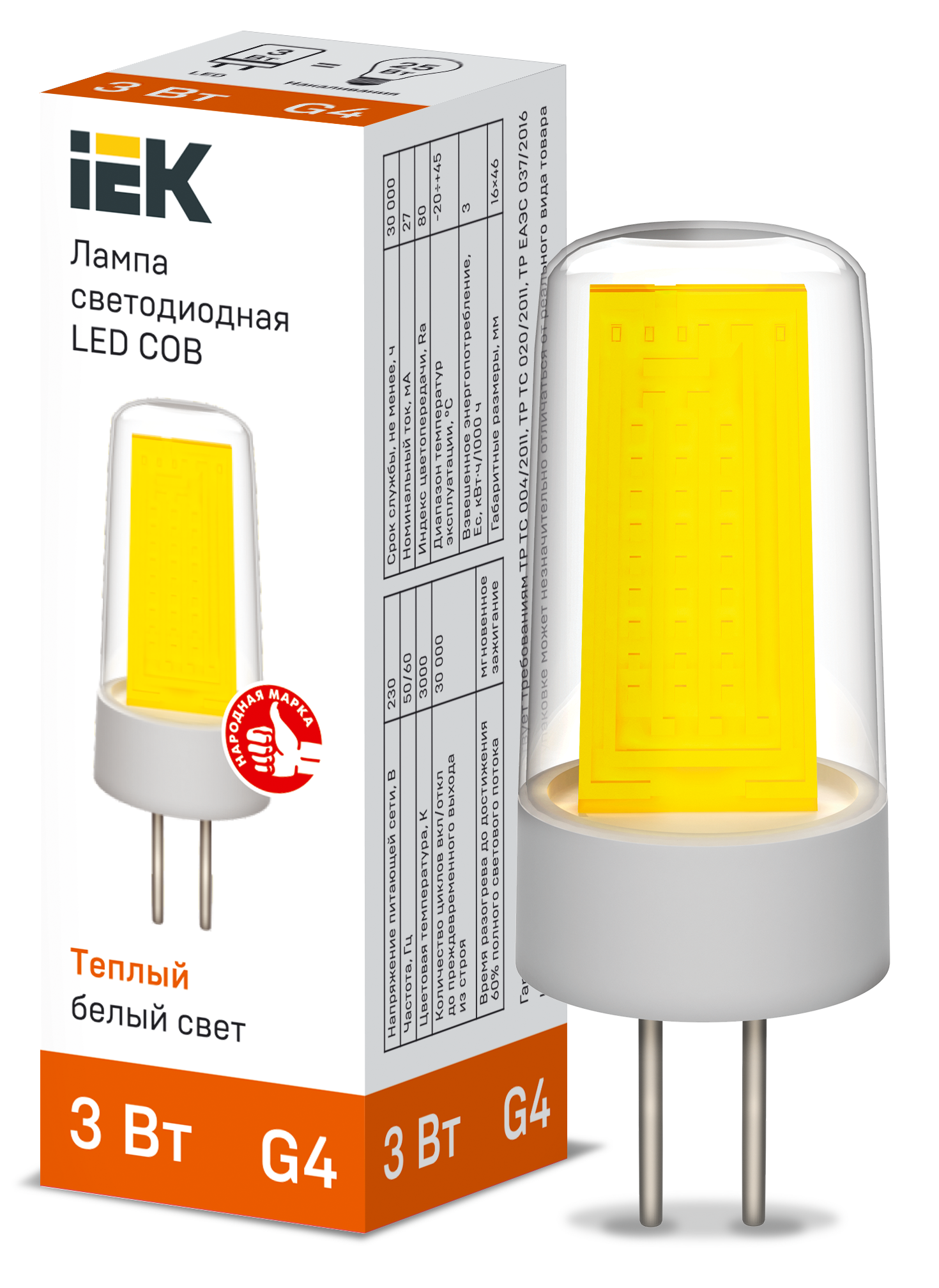 Наименование: Лампа светодиодная COB капсула 3Вт 230В 3000К керамика G4 IEK