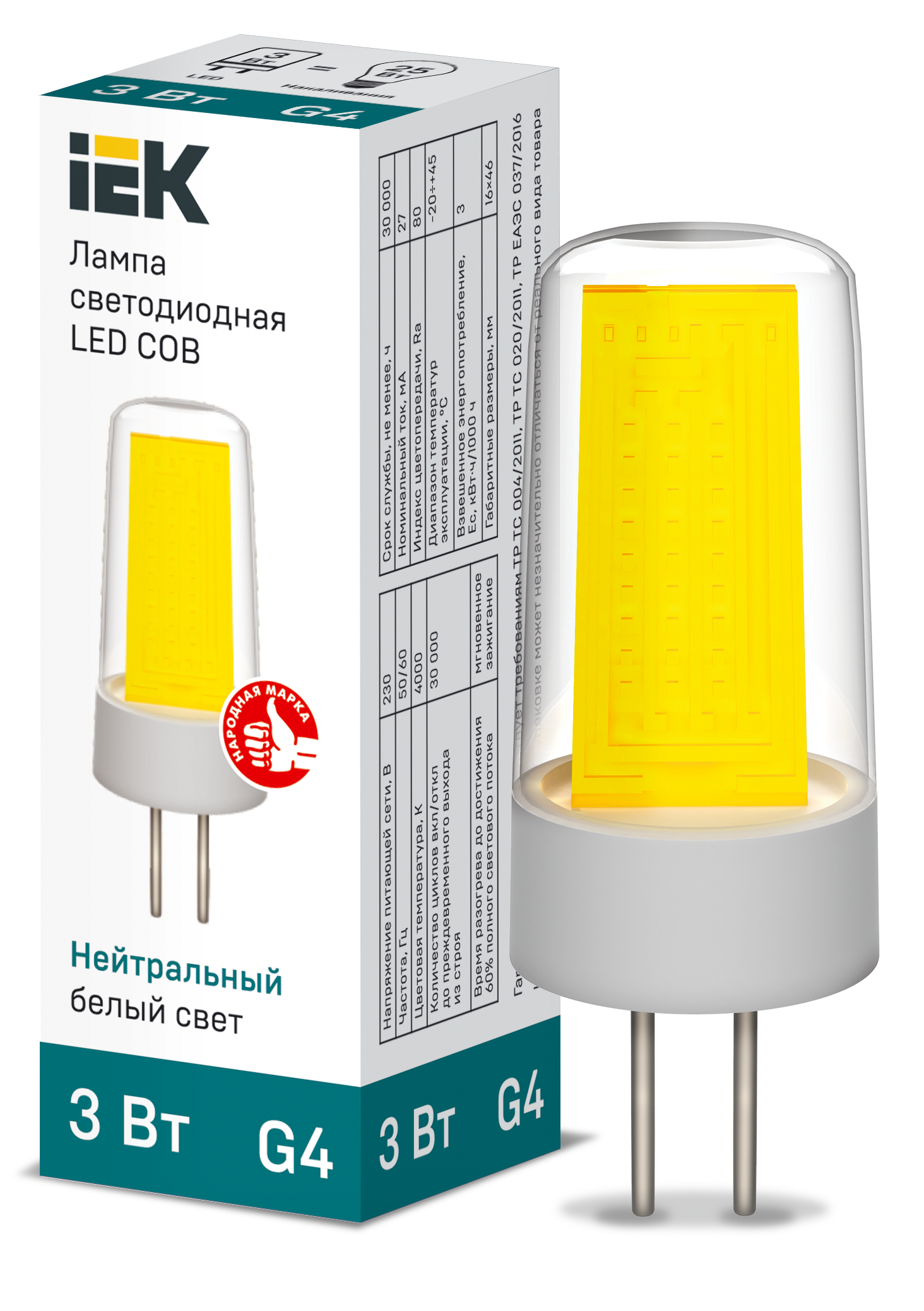 Наименование: Лампа светодиодная COB капсула 3Вт 230В 4000К керамика G4 IEK