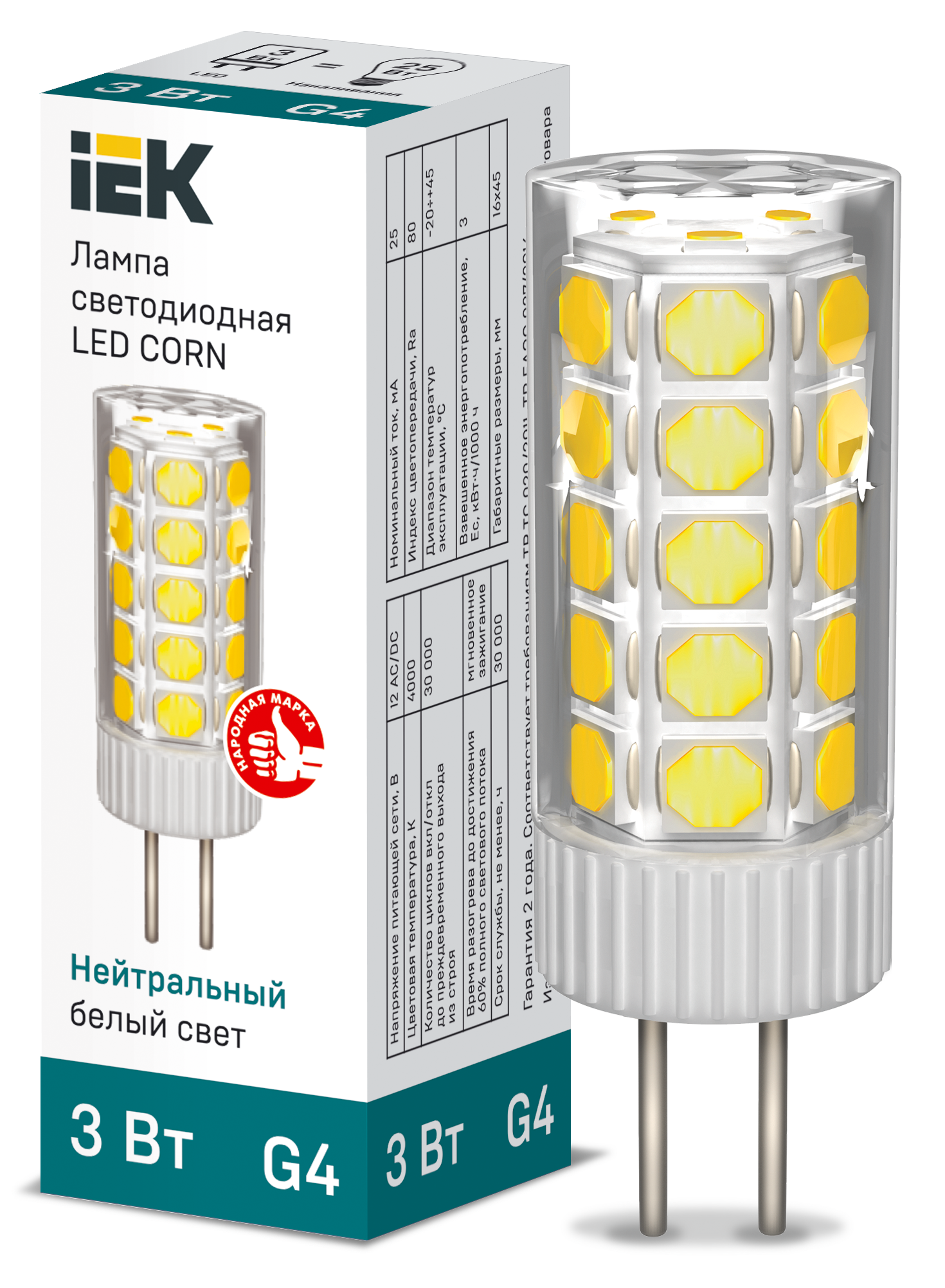 Наименование: Лампа светодиодная CORN капсула 3Вт 12В 4000К керамика G4 IEK