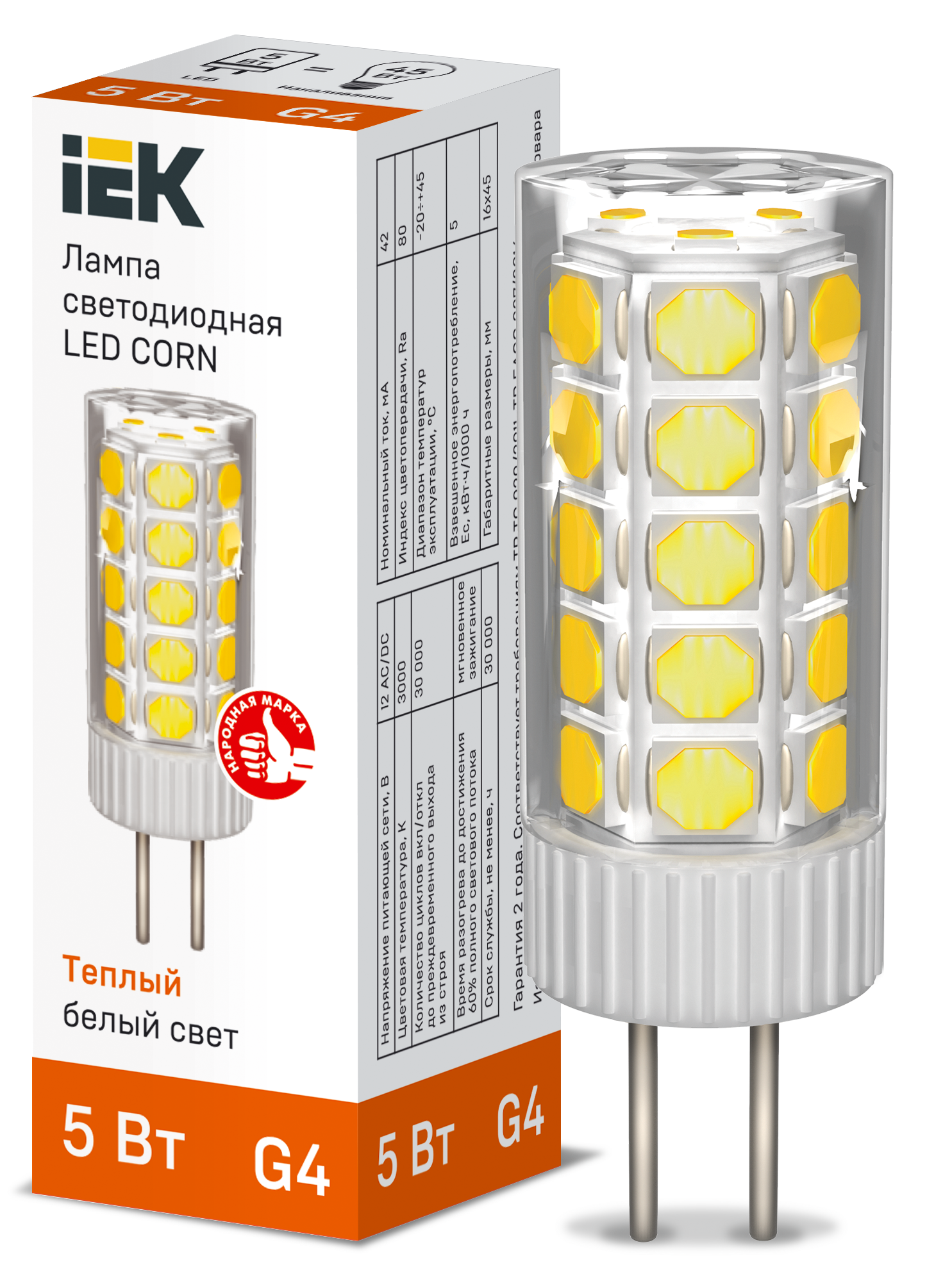 Наименование: Лампа светодиодная CORN капсула 5Вт 12В 3000К керамика G4 IEK