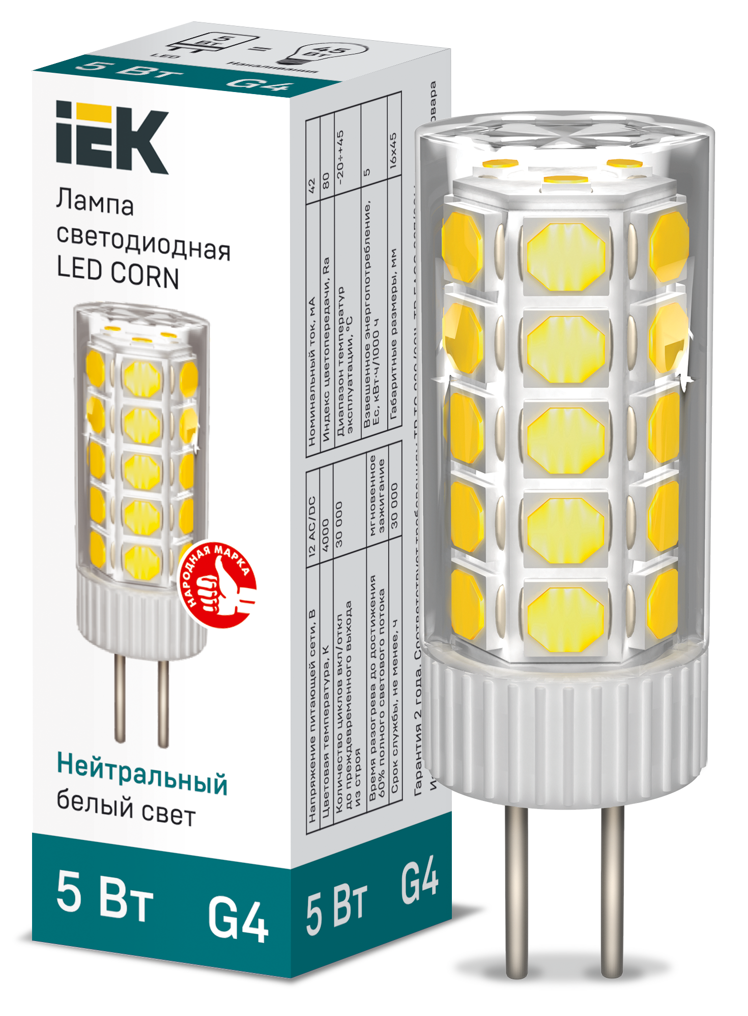 Наименование: Лампа светодиодная CORN капсула 5Вт 12В 4000К керамика G4 IEK