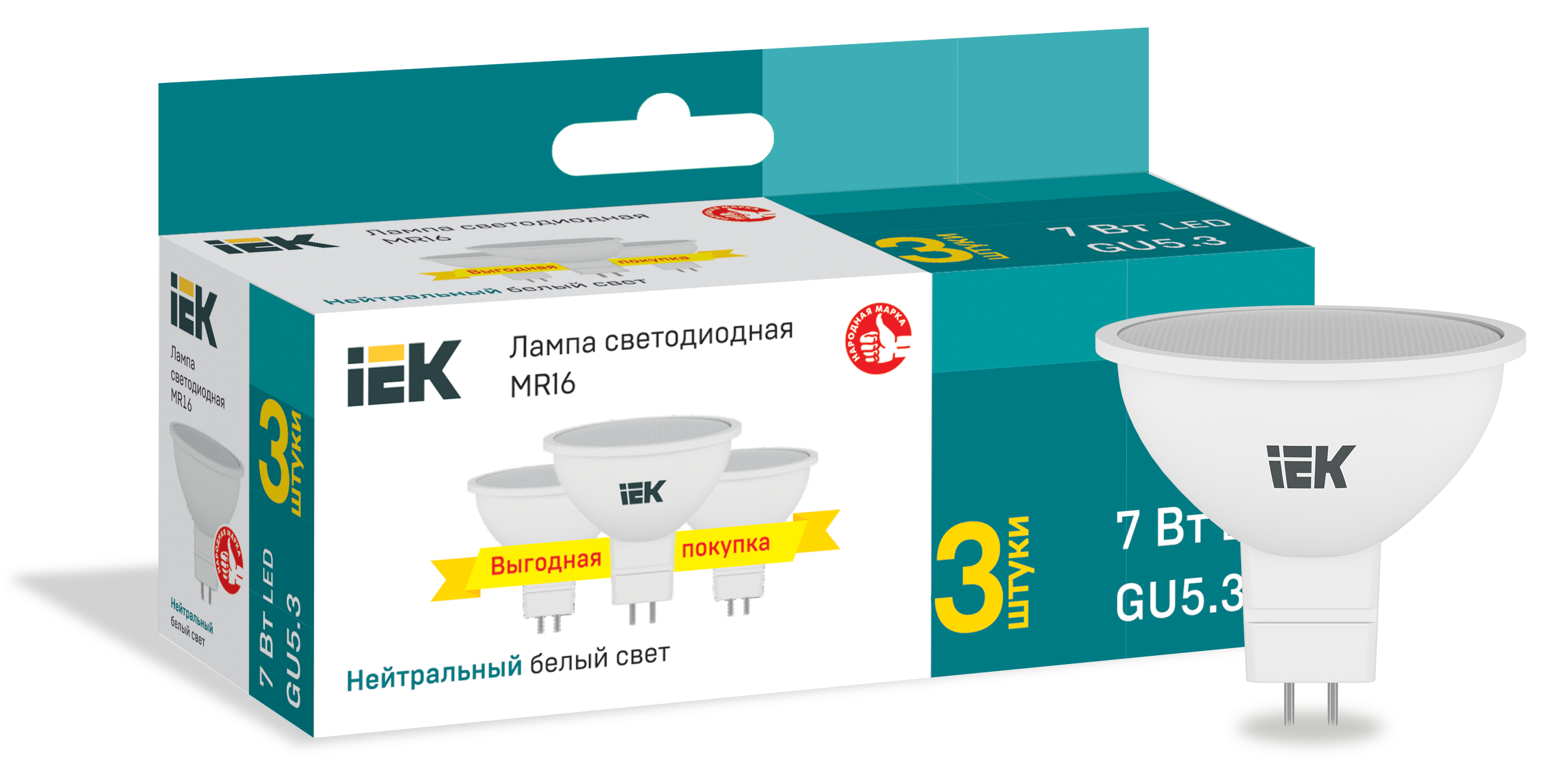 Наименование: Лампа светодиодная MR16 софит 7Вт 230В 4000К GU5,3 (3шт/упак) IEK