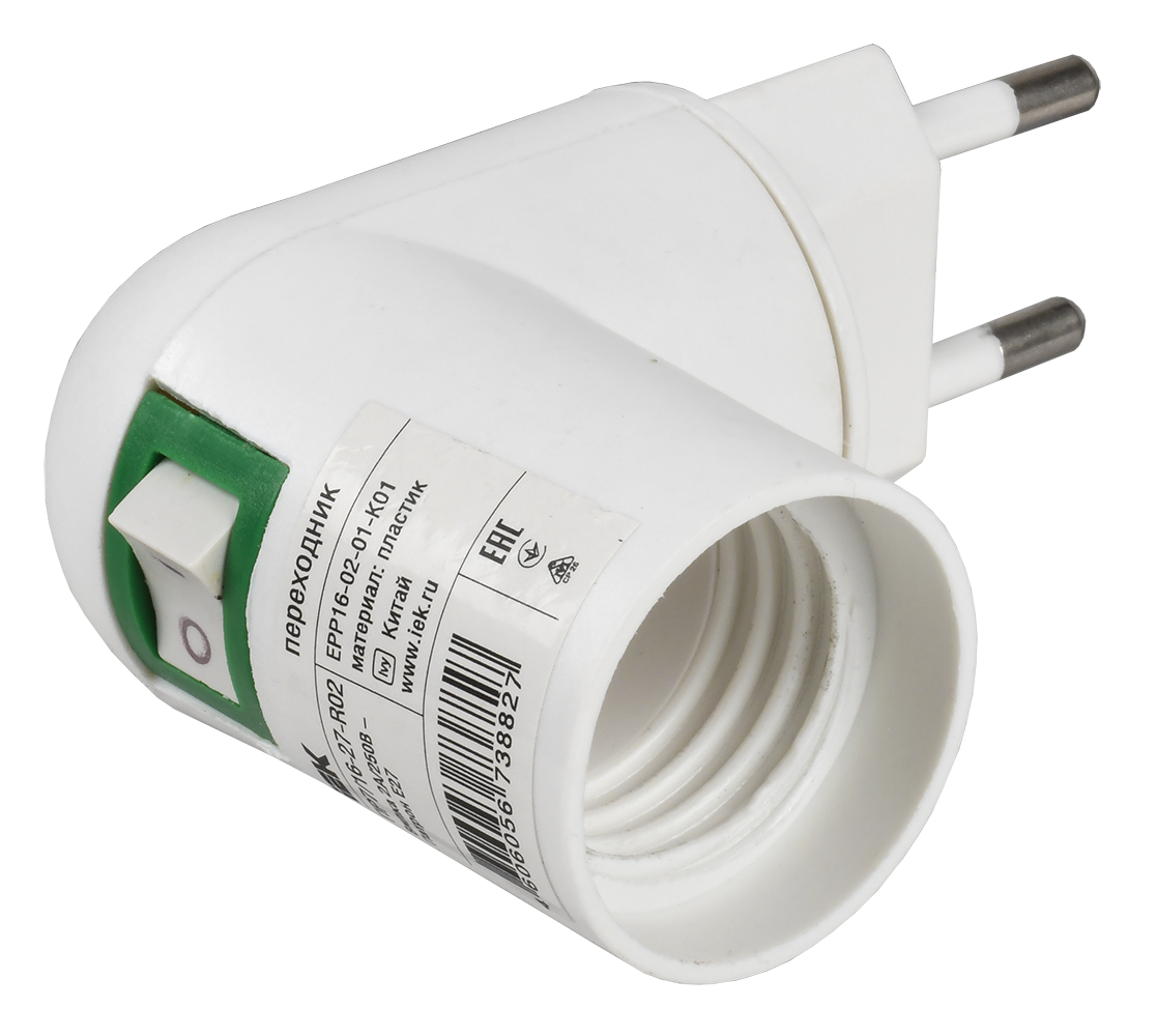 Наименование: Переходник ПР7/16-27-R02 вилка 220В-патрон Е27 пластик белый IEK