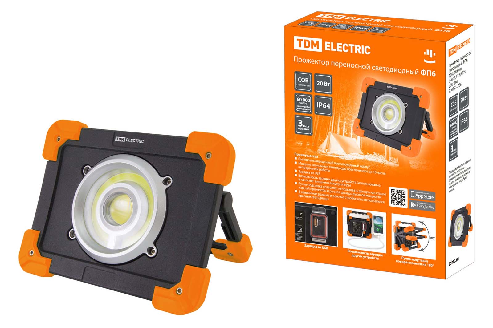 Наименование: Прожектор переносной светодиодный ФП6, 20 Вт, 1800 лм, Li-Ion 3,7 B 6,6 A*ч, USB, TDM