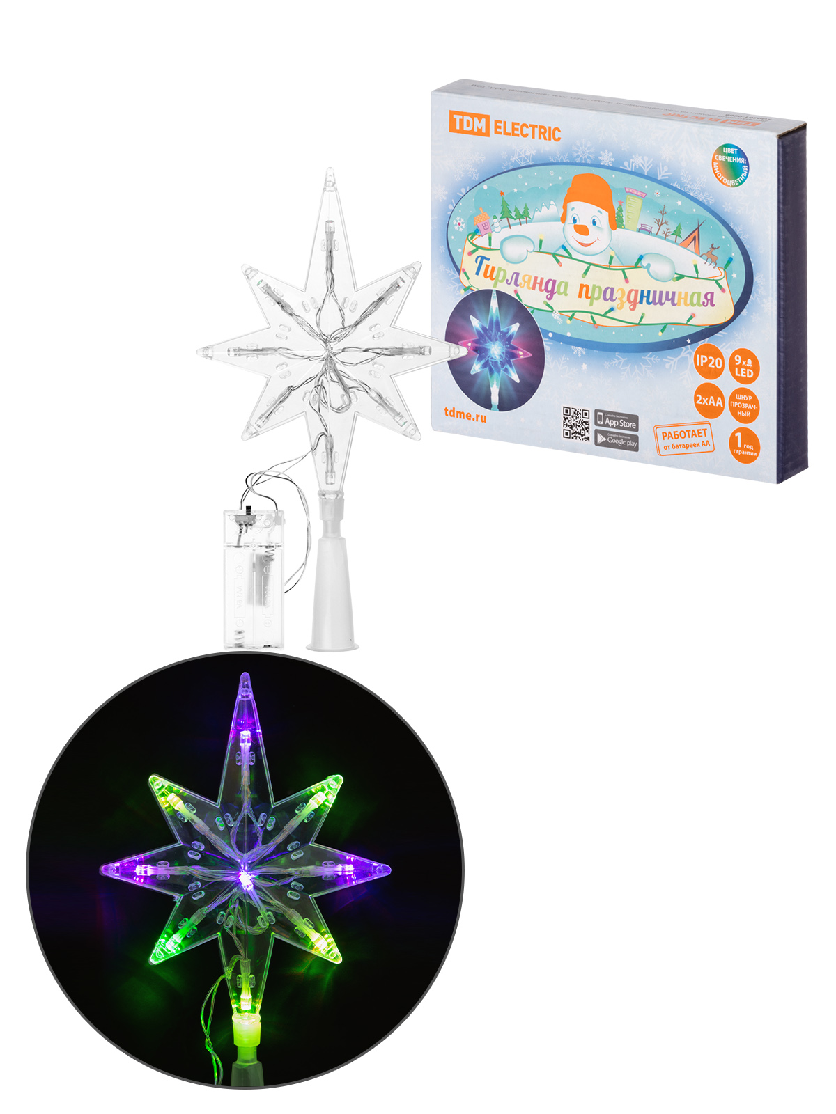Наименование: Декоративный элемент на ёлку светодиодный "Звезда" 9LED, 20см, мультиколор, 2хAA , TDM
