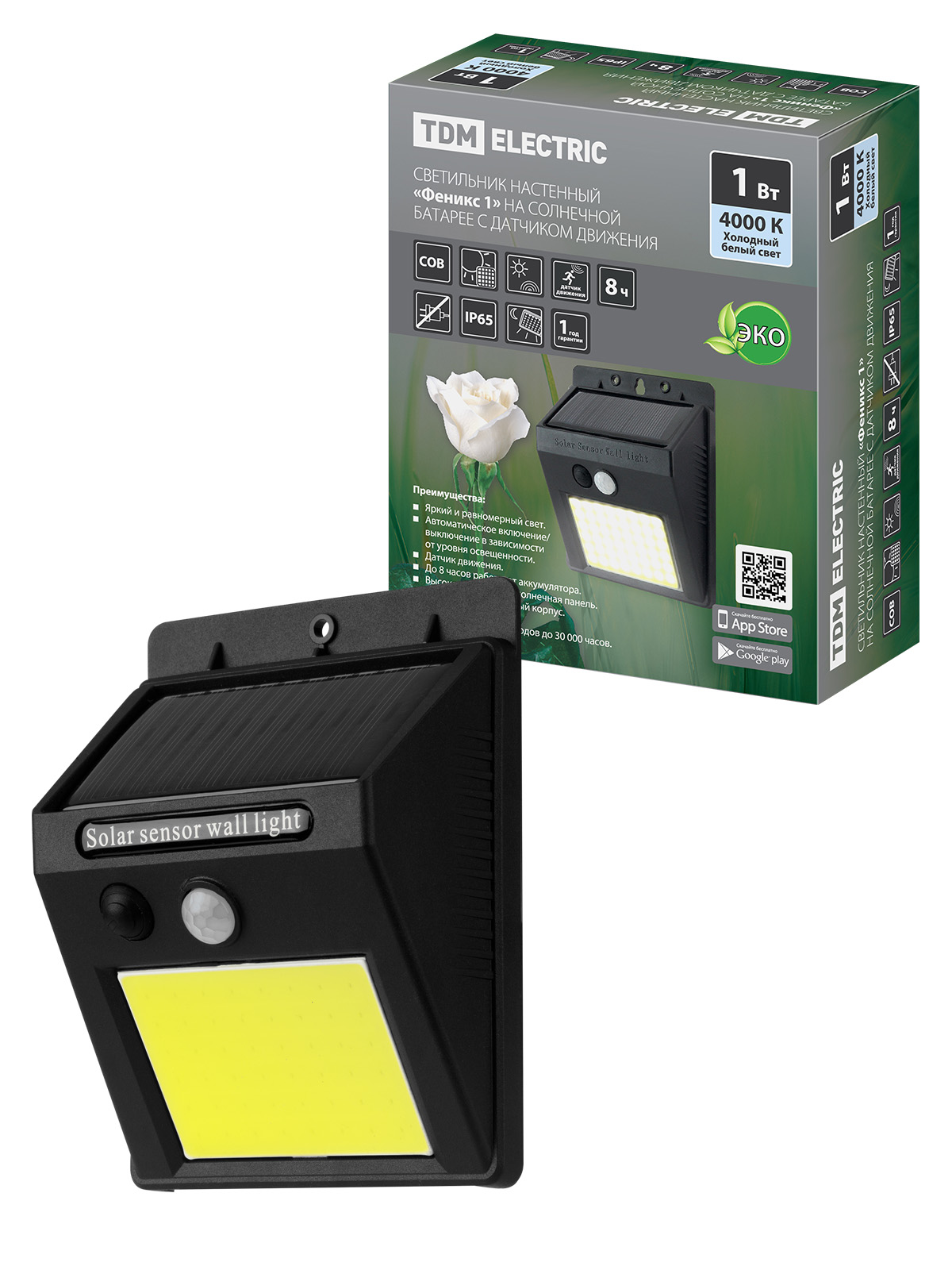 Наименование: Светильник настенный "Феникс 1" на солн. батарее с датч. движ., 1 Вт, IP65, пластик, черн., TDM