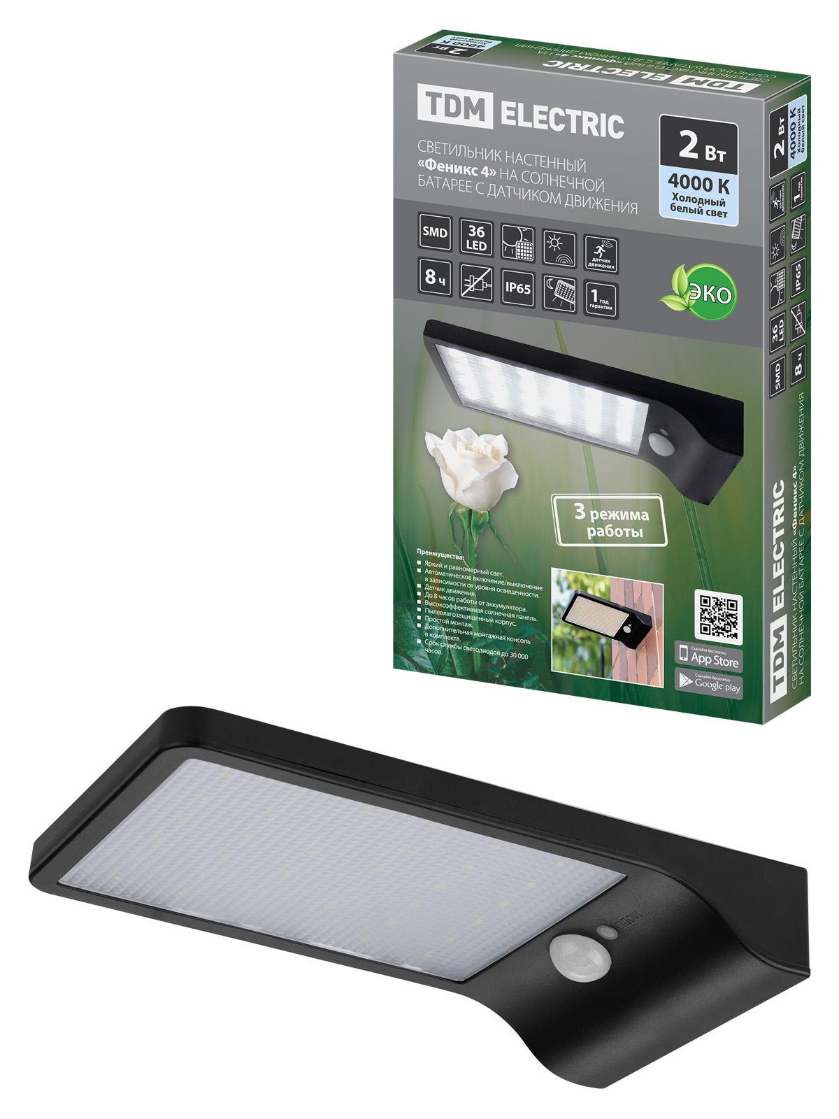 Наименование: Светильник настенный "Феникс 4" на солн. батарее с датч. движ., 2 Вт, IP65, пластик, черн., TDM