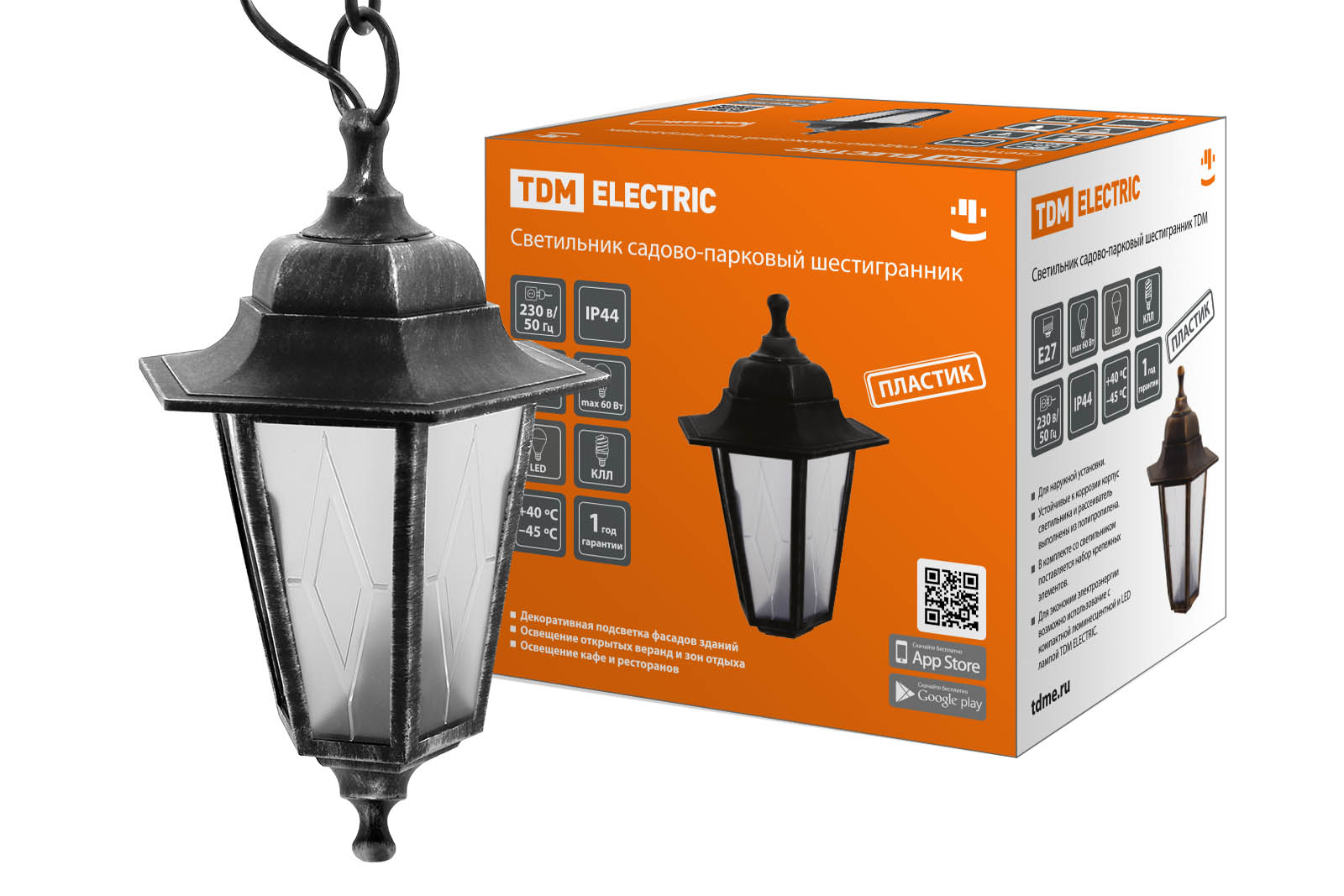 Наименование: Светильник садово-парковый НСУ 06-60-001 шестигр., подвес, пластик, расс.пластик, серебро TDM